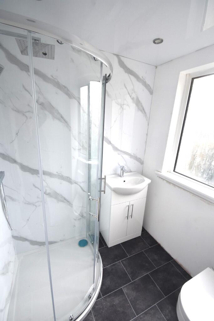 <br />The stunning bathroom only fitted a year ago, has wall tiling in ceramic slate effect, and paling grey, with sunk in spot lighting. There is a jacuzzi bath with both rain shower and hand held shower.