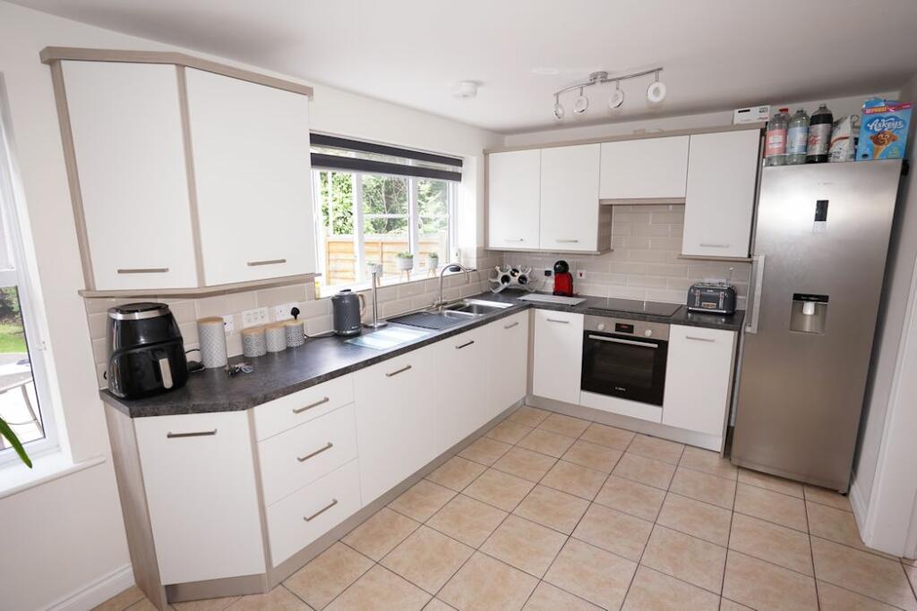 <br />KITCHEN: 9' 11" x 9' (3.03m x 2.74m) Comprising of a matching range of base and eye-level units with roll edge work surface. Inset stainless steel sink with side drainer and tap over. Space for electric oven with extractor hood over. Space and plumbing for further appliances. UPVC double glazed window to the rear and door to the side elevation. Ceiling light point. Central heating boiler. Under stairs storage cupboard.