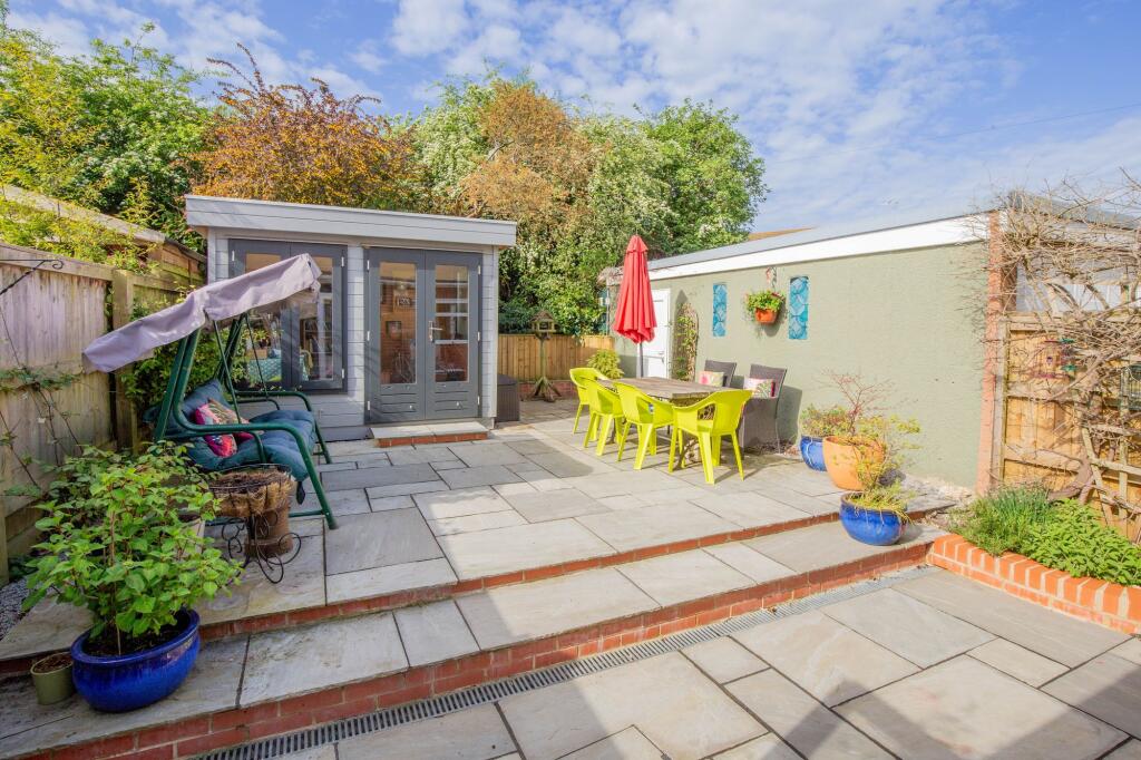 The property includes a garden with a patio area and what appears to be a garden shed, which is a desirable feature for many buyers. The shed itself seems to be well-constructed and provides additional storage or workspace.