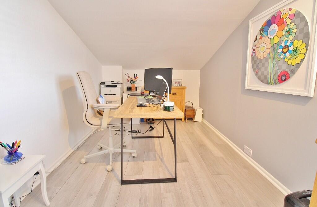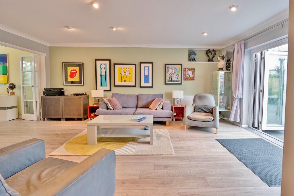 The property itself appears to be in excellent condition, having undergone recent modernisation and refurbishment. The images showcase a contemporary interior with updated fixtures and fittings. The kitchen and bathrooms are particularly well-presented, suggesting a high standard of maintenance and upgrades. The garden is a significant feature, offering a sizeable outdoor space with well-maintained landscaping and attractive features such as a decked area and pergola.