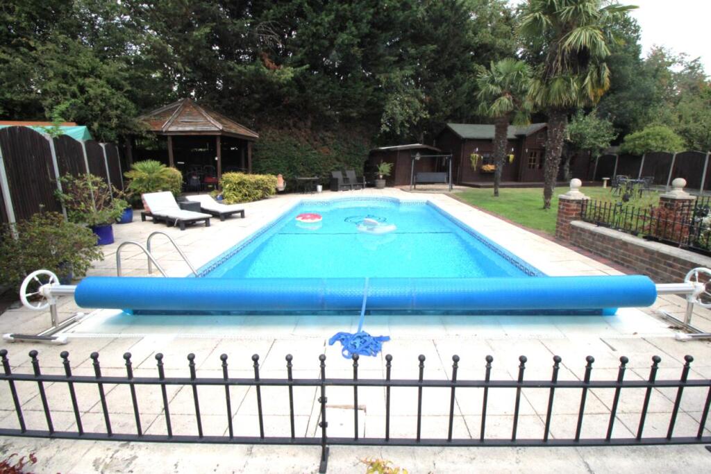 This is a semi-detached bungalow located in Upminster, Essex. The property features 4 bedrooms and 2 bathrooms. The property also benefits from a well-maintained garden with a swimming pool and outbuildings.