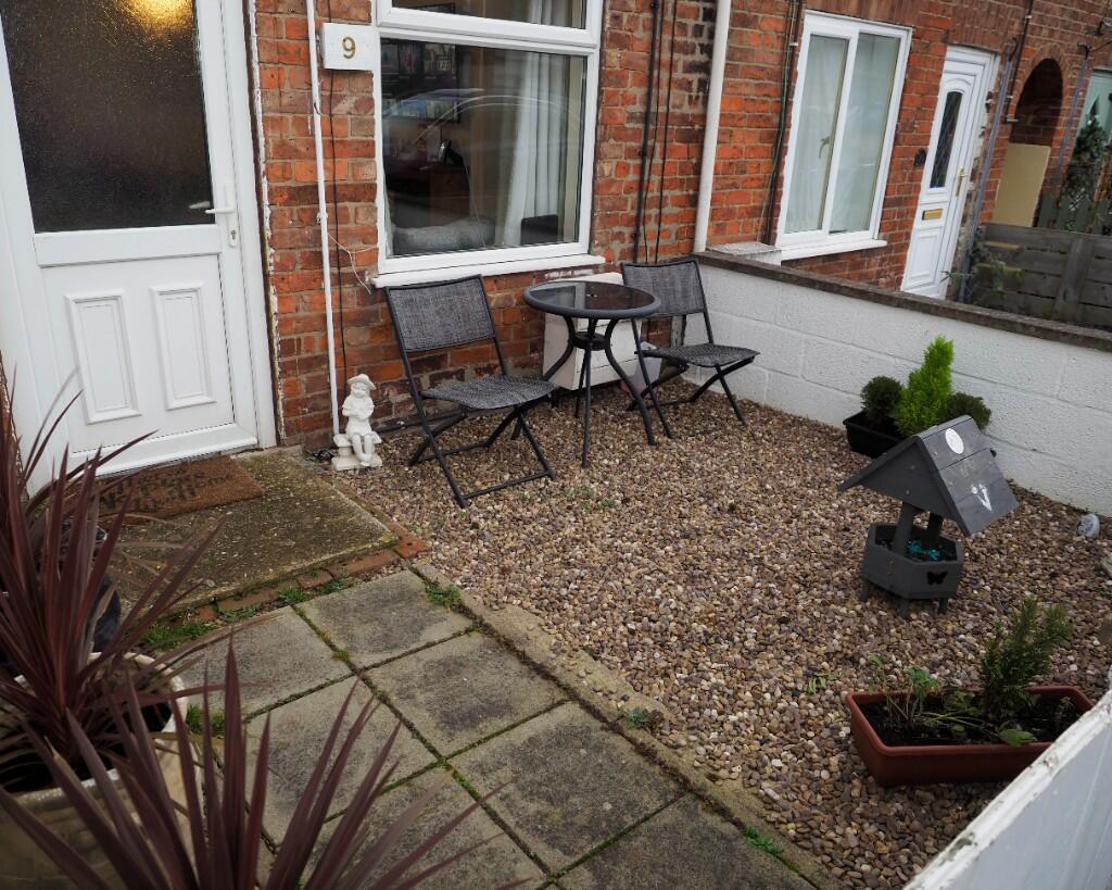 The outdoor space is minimal, comprising a small paved yard with gravel rather than a usable garden. This lack of significant outdoor area is a noticeable drawback for potential buyers seeking garden space.
