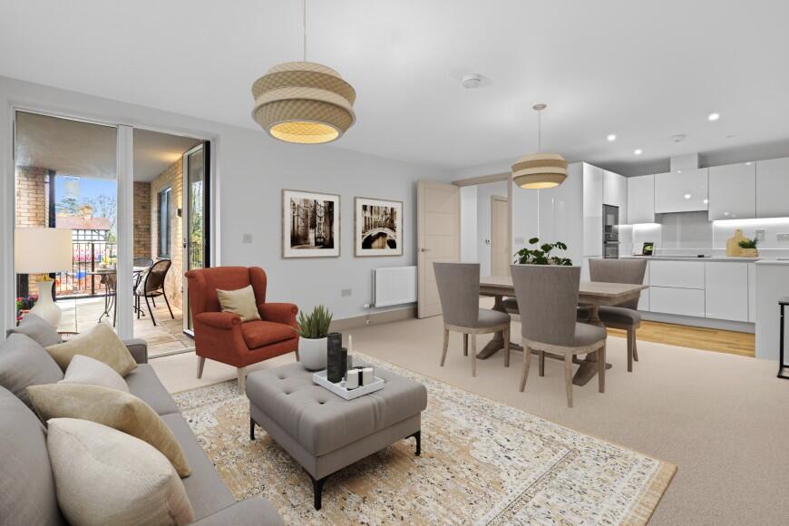A contemporary two double bedroom apartment featuring an open plan kitchen/lounge/dining area, ideal for flexible modern living, with double doors opening onto the generous private balcony.
