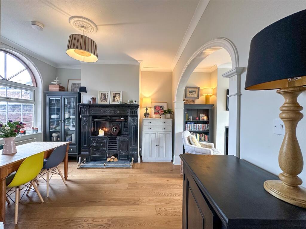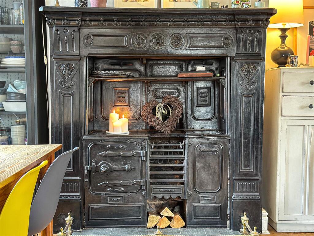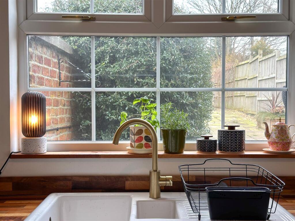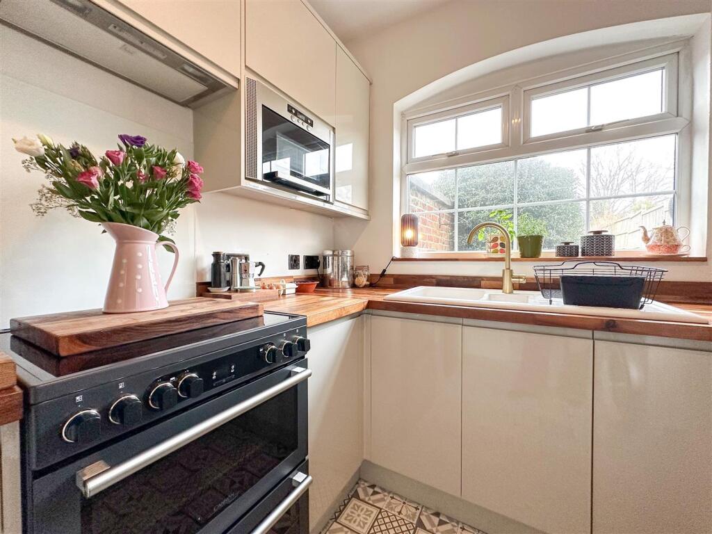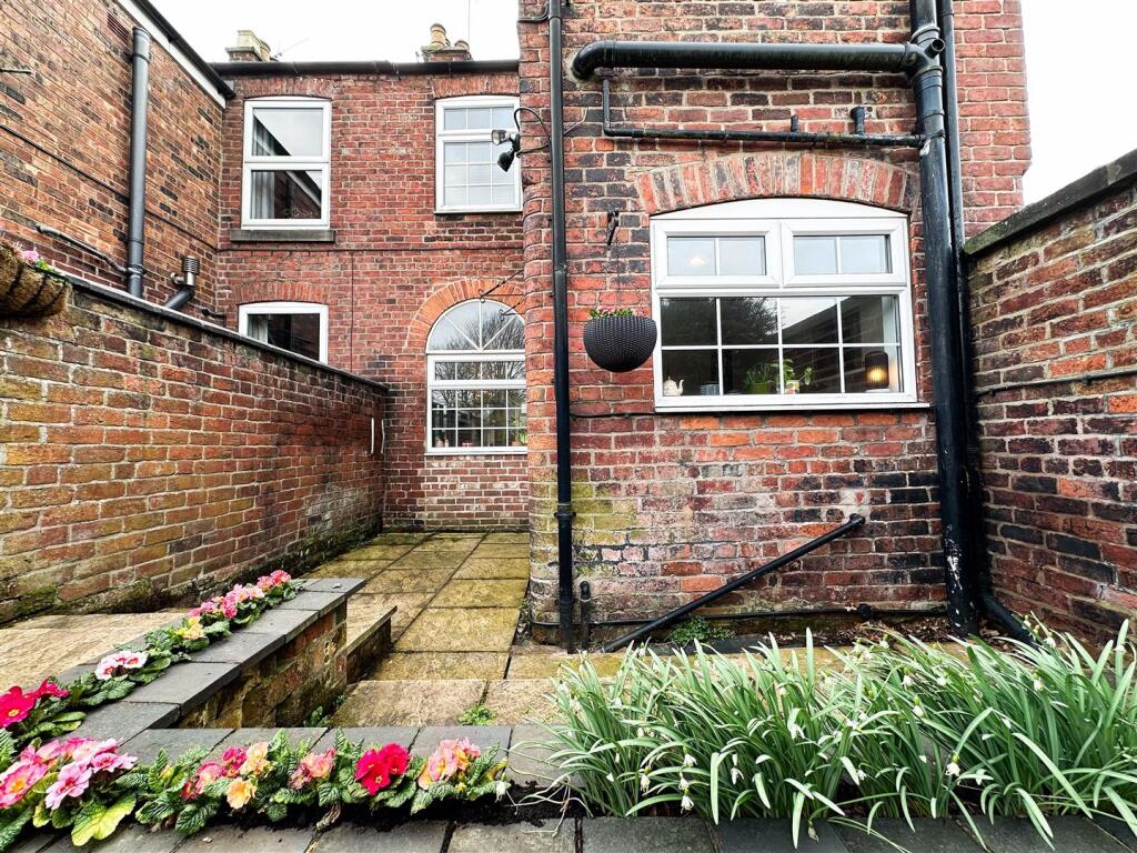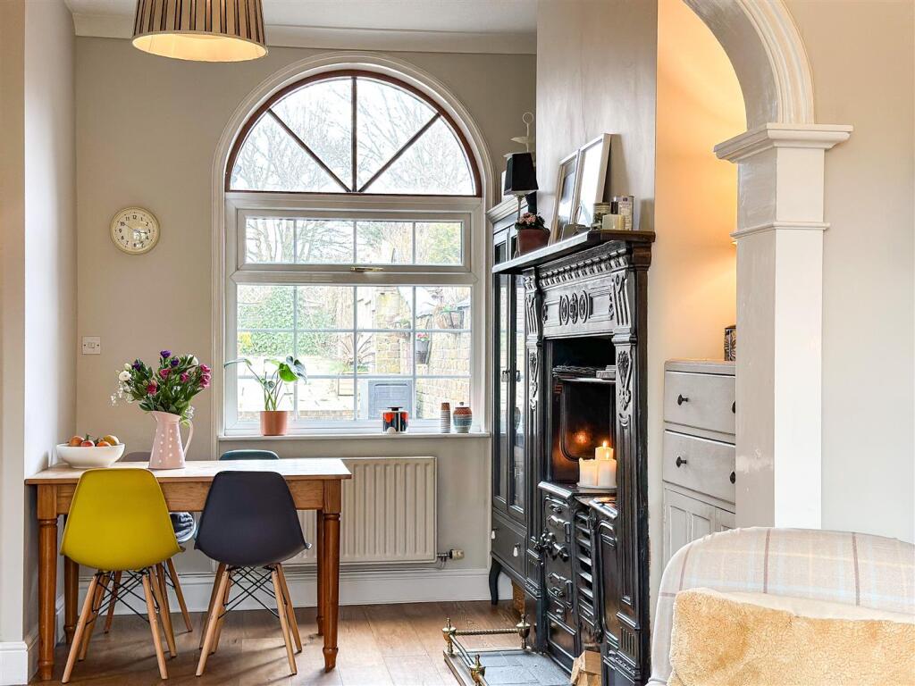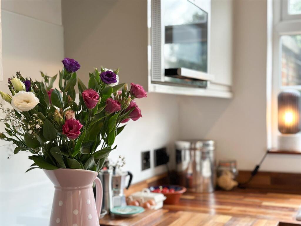 The property itself appears to be well-maintained and presented. The images show a modern kitchen and bathroom, suggesting recent renovations. The interior is tastefully decorated and the property benefits from character features such as the original fireplaces. The garden is relatively small but well-maintained and provides a private outdoor space.