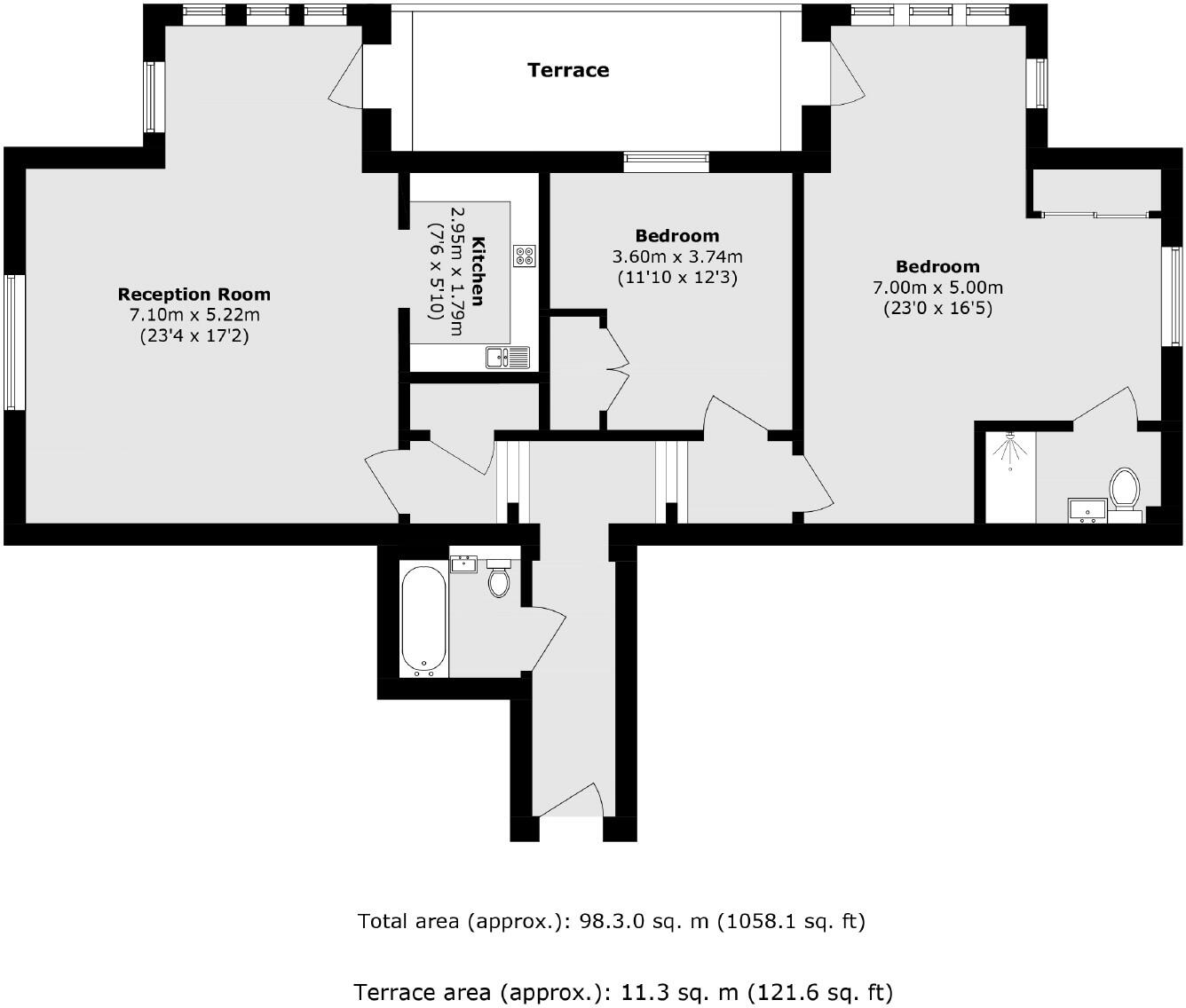 Presented in excellent condition, this bright and well-designed two double-bedroom flat is situated on the third floor of the apartment complex. The property benefits from a large bathroom, in addition to an en suite in the main bedroom, and a private terrace space.