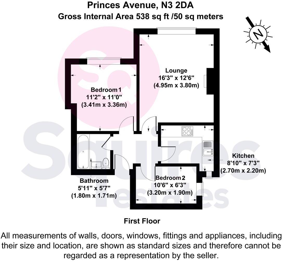 This is a two-bedroom flat located on Princes Avenue in Finchley. The property is listed with Squires Estates. The flat offers 485.19 sqft of living space. The property is located in a good location, with nearby schools and transportation links. The flat appears to be in good condition, with a modern kitchen and bathroom. The asking price of £385,000 seems reasonable when compared to the average property price in the area.