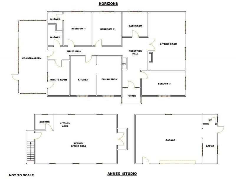 ENJOYING WONDERFUL VIEWS A MOST SPACIOUS 3 BEDROOMED DETACHED BUNGALOW WITH 2 RECEPTION ROOMS, CONSERVATORY AND 3 BATHROOMS STANDING IN A LARGE GARDEN EXTENDING TO JUST UNDER 1 ACRE AND HAVING A SELF CONTAINED DETACHED ANNEX / STUDIO WITH GARAGE AND A STABLE BLOCK WITH FURTHER ATTACHED GARAGING. ...