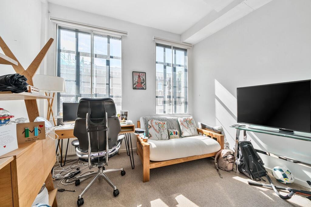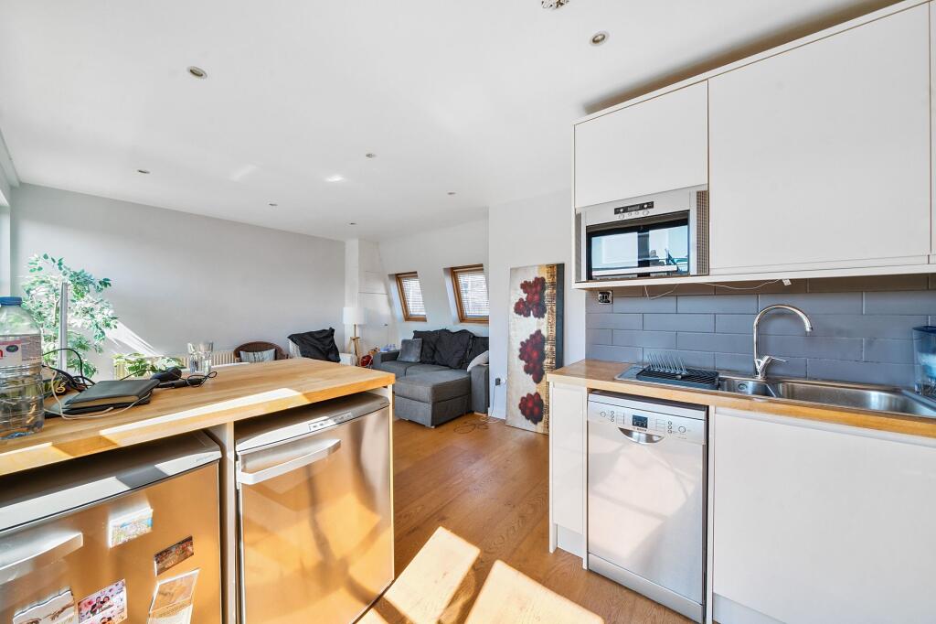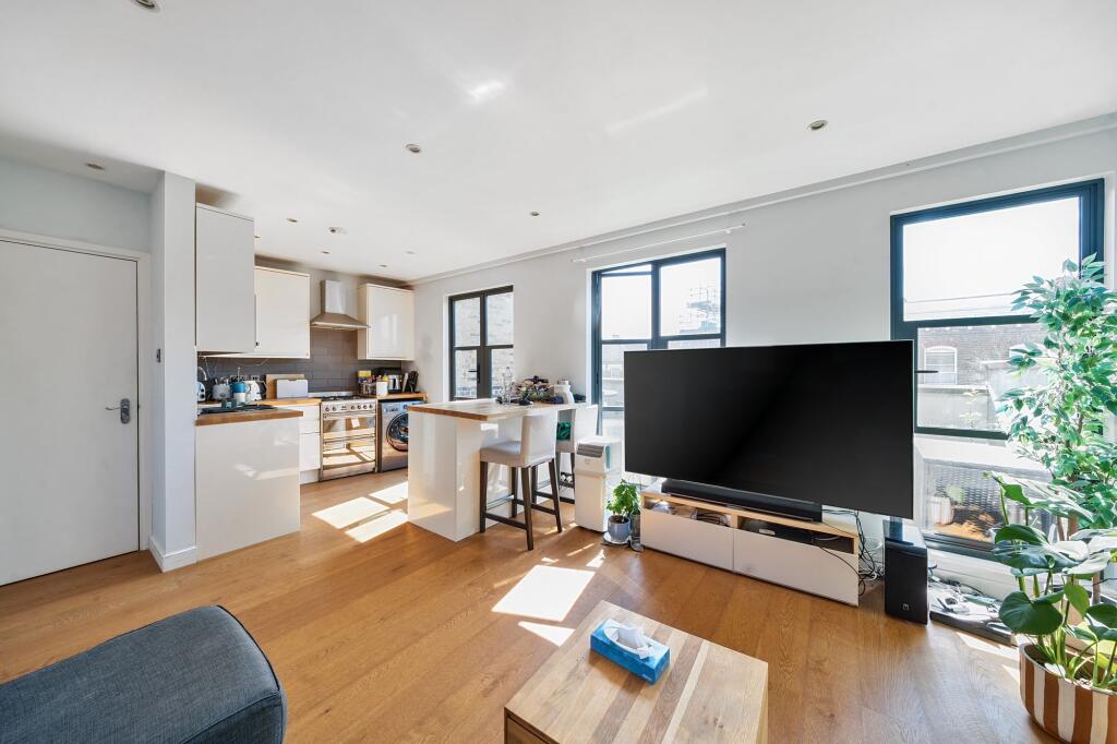 This spacious maisonette offers 843 square feet of living space and comprises 2 double bedrooms, 2 bathrooms (one ensuite) and a large, dual-aspect kitchen / reception with direct access to a private, south-east facing roof terrace.