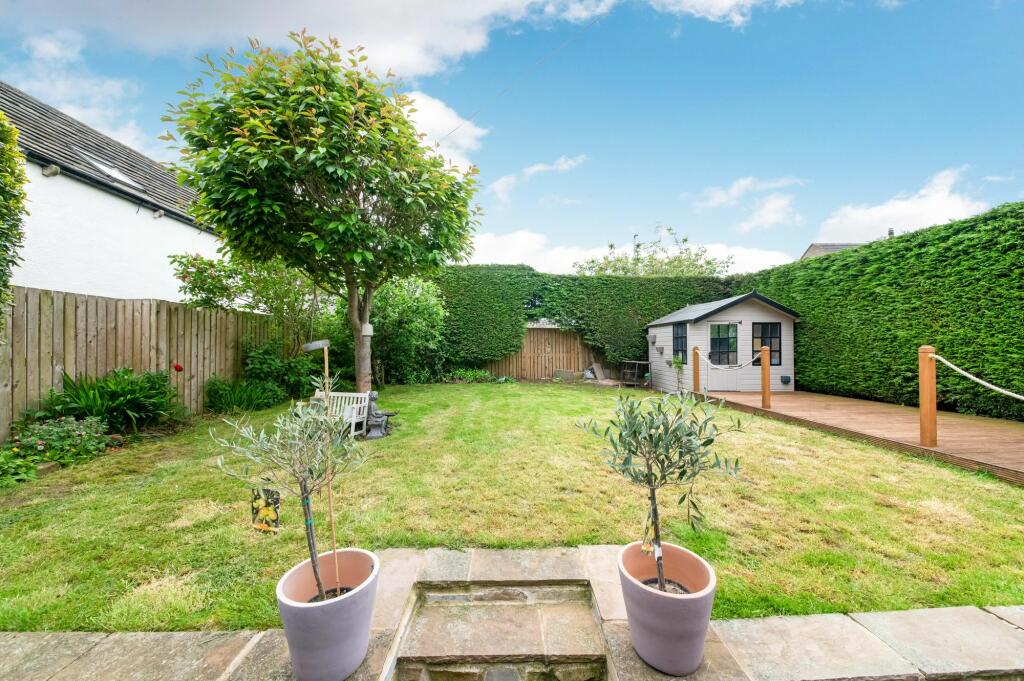 Buttermilk Cottage presents as a beautifully renovated five-bedroom home located in the sought-after village of Emley, West Yorkshire. The property benefits from a stylish contemporary interior with high-quality fixtures and fittings, as shown in the detailed images which highlight a modern kitchen, extension, and multiple updated bathrooms. The exterior features a stone-built facade, which is typical of the local architectural style, alongside an attractive garden featuring a patio area and shed.