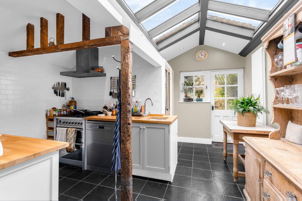 Charming 19C Grade II Listed cottage in Stanstead Abbotts with original features, a 70' garden, garage, gym/studio, 2 receptions, kitchen with glazed roof, 3 beds, near amenities & transport links.
