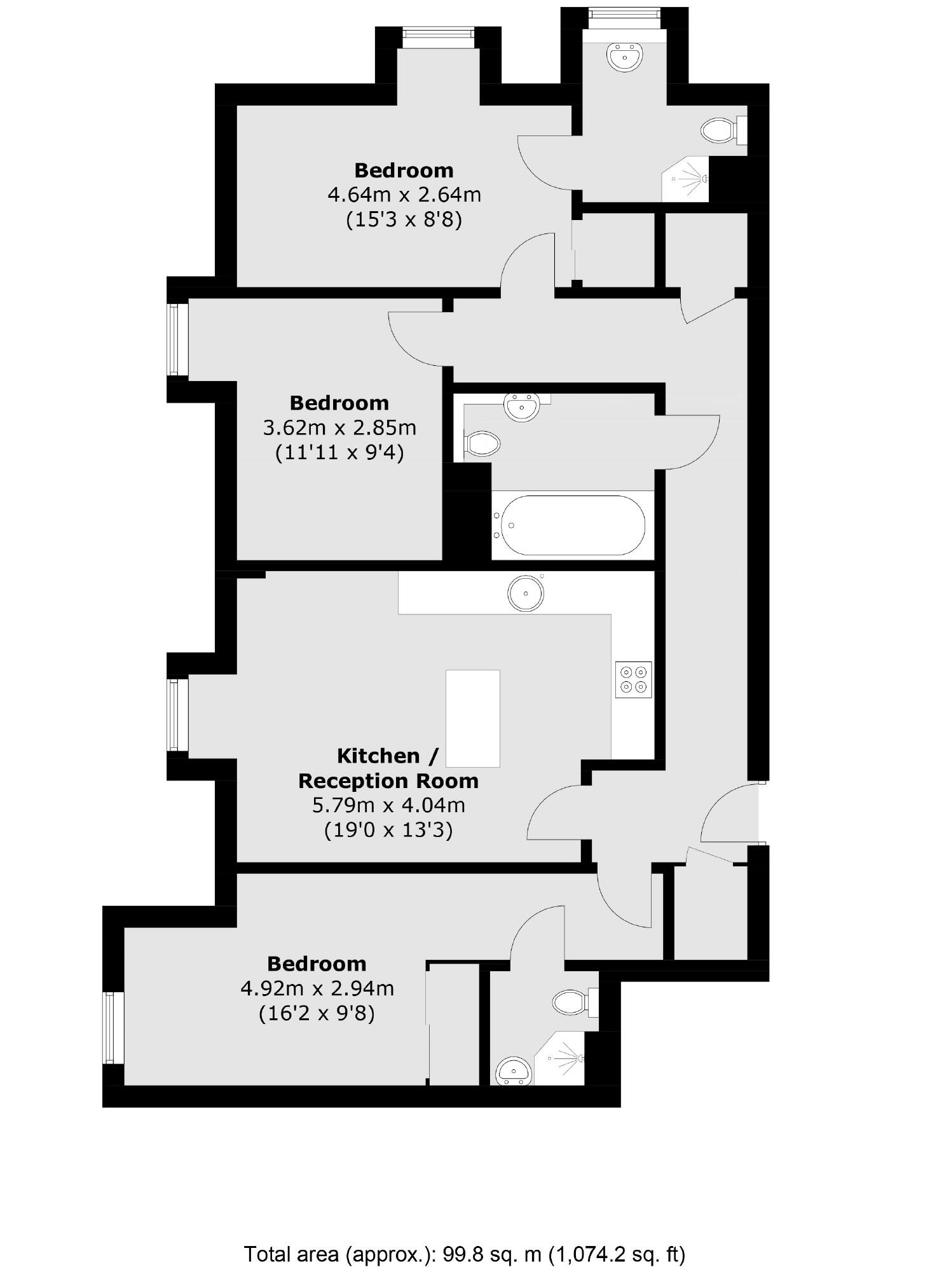 A large three double bedroom apartment with bright reception room, open plan fully kitted kitchen, three bathrooms and access to communal gardens.