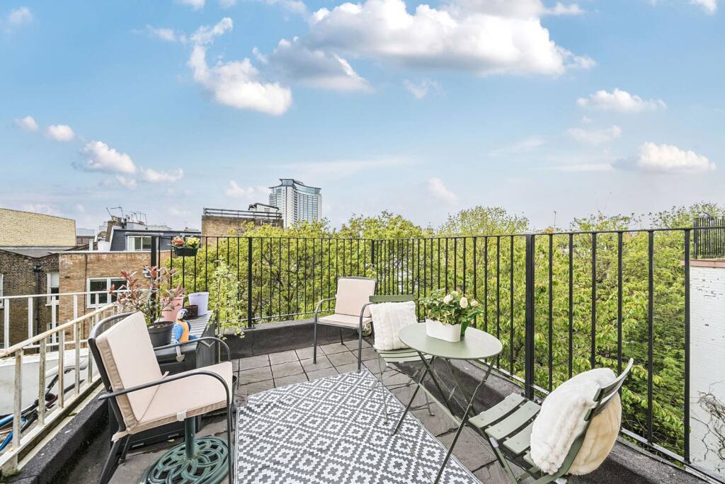 Stunning 3 bedroom flat in Earls Court featuring a really large open plan kitchen/reception room, bright cosy decor, three excellent sized bedrooms, very ample storage space and a roof terrace.