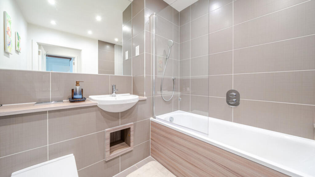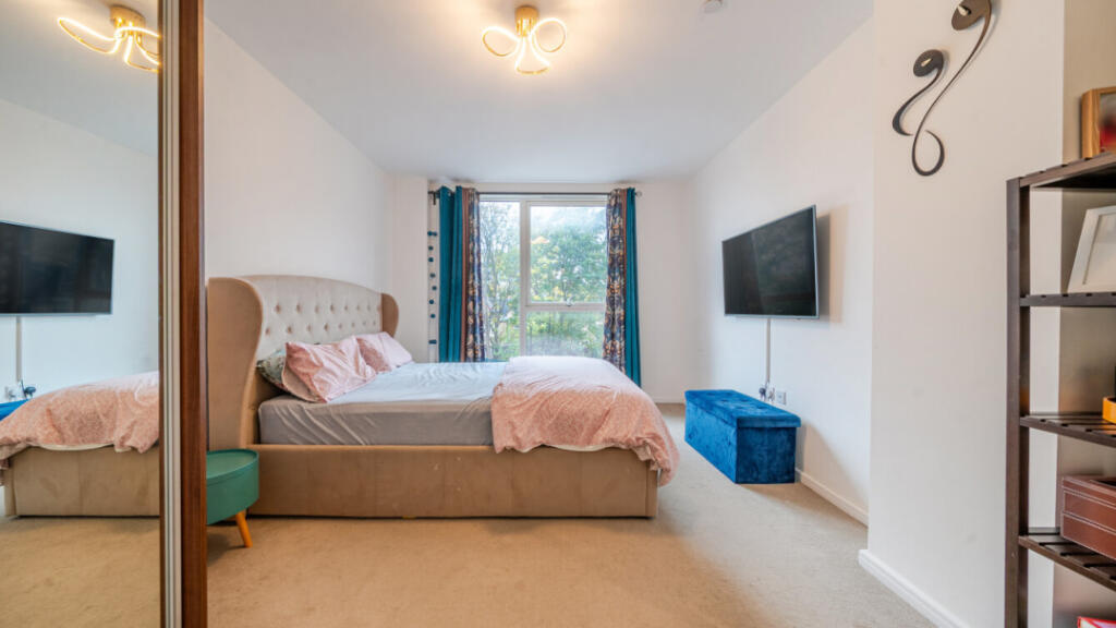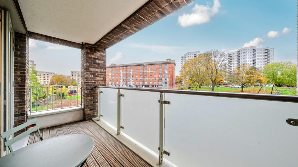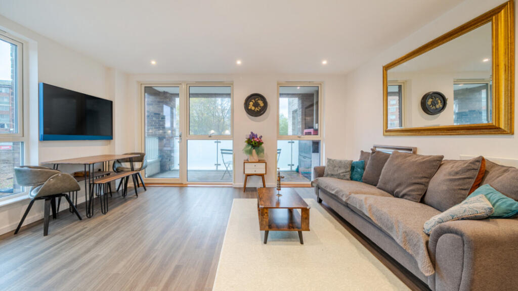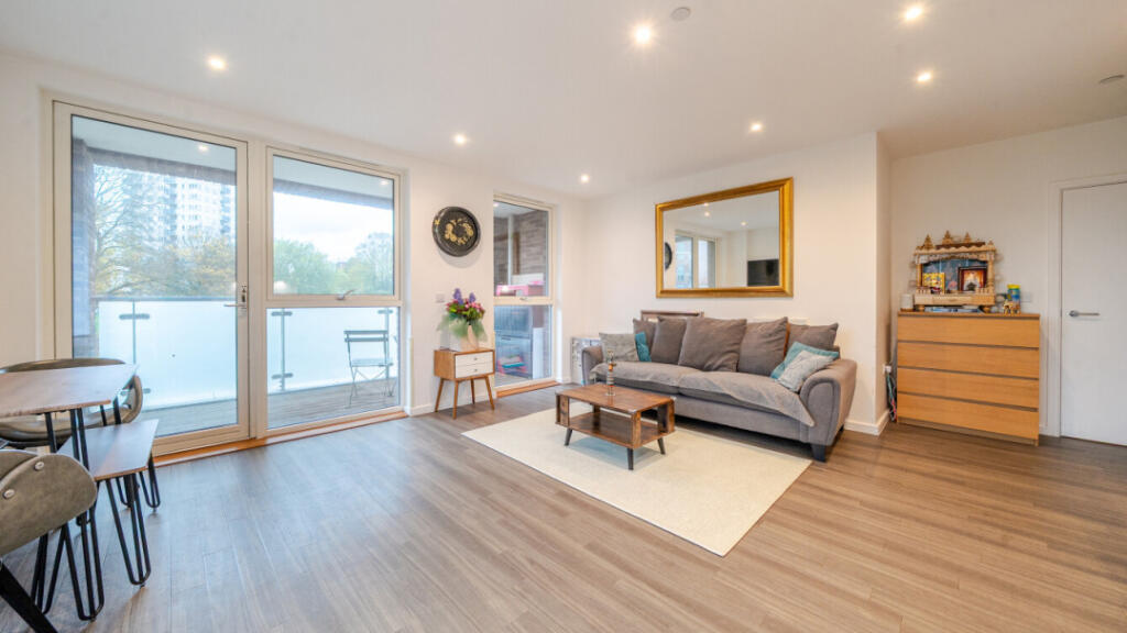 This is a modern two-bedroom flat in South Acton. The property appears to be in good condition and benefits from nearby schools and transportation. The flat includes a balcony. The price seems reasonable for the area, but the lack of square footage data makes it difficult to assess the value precisely.
