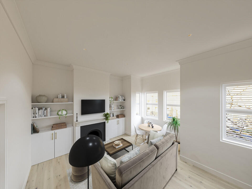Sleek two bedroom first floor period conversion flat of 579 square feet, with a new lease of 125 years. Your newly-renovated home will be ready for you in February. The location is a pretty and peaceful one-way residential street in prime East Dulwich/Peckham Rye borderland.
