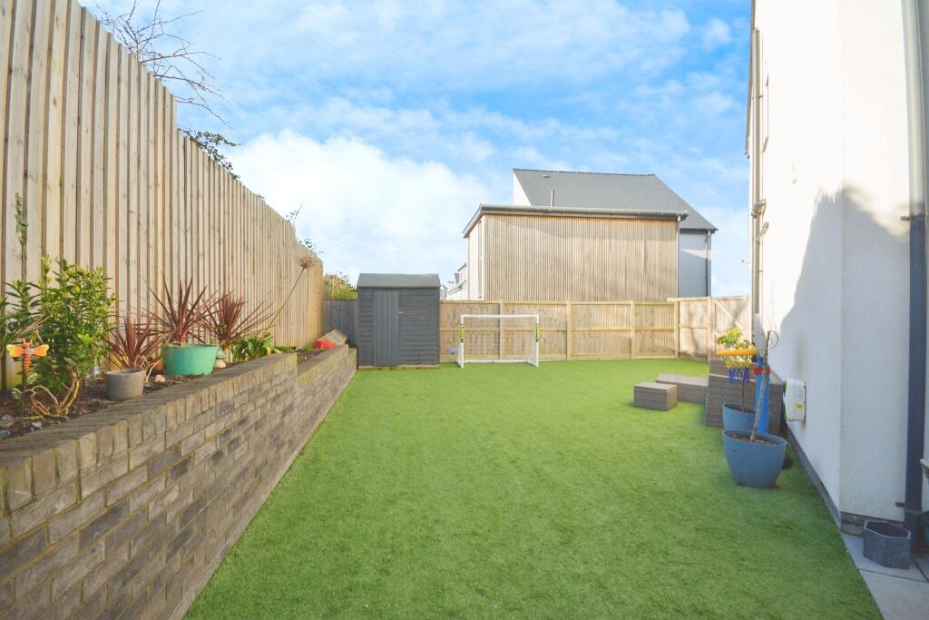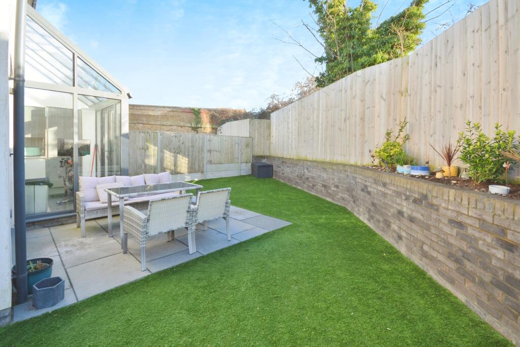 The property includes a garden with artificial turf, offering a private outdoor space. While the exact plot size isn’t specified, the images suggest a reasonably sized garden for this type of property.