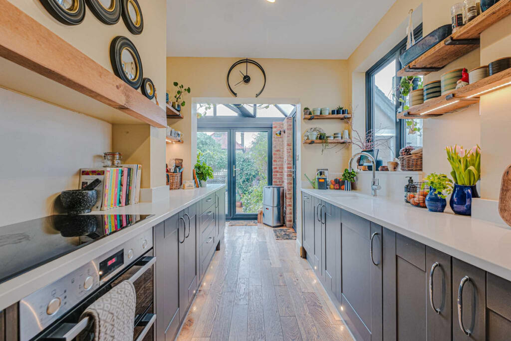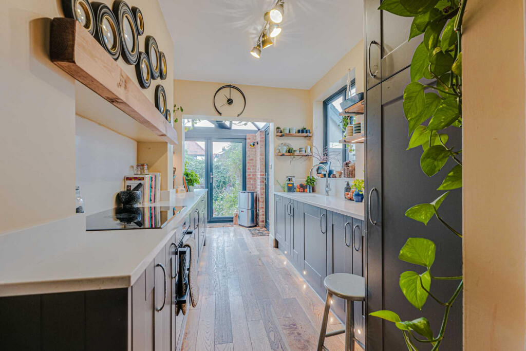 The property itself appears to be well-maintained and recently updated. The images show a modern kitchen and bathroom, suggesting recent renovations. The interior design is stylish and contemporary, and the property seems to be in excellent condition overall. The presence of a garden, as shown in the aerial and ground-level photographs, adds to its appeal.