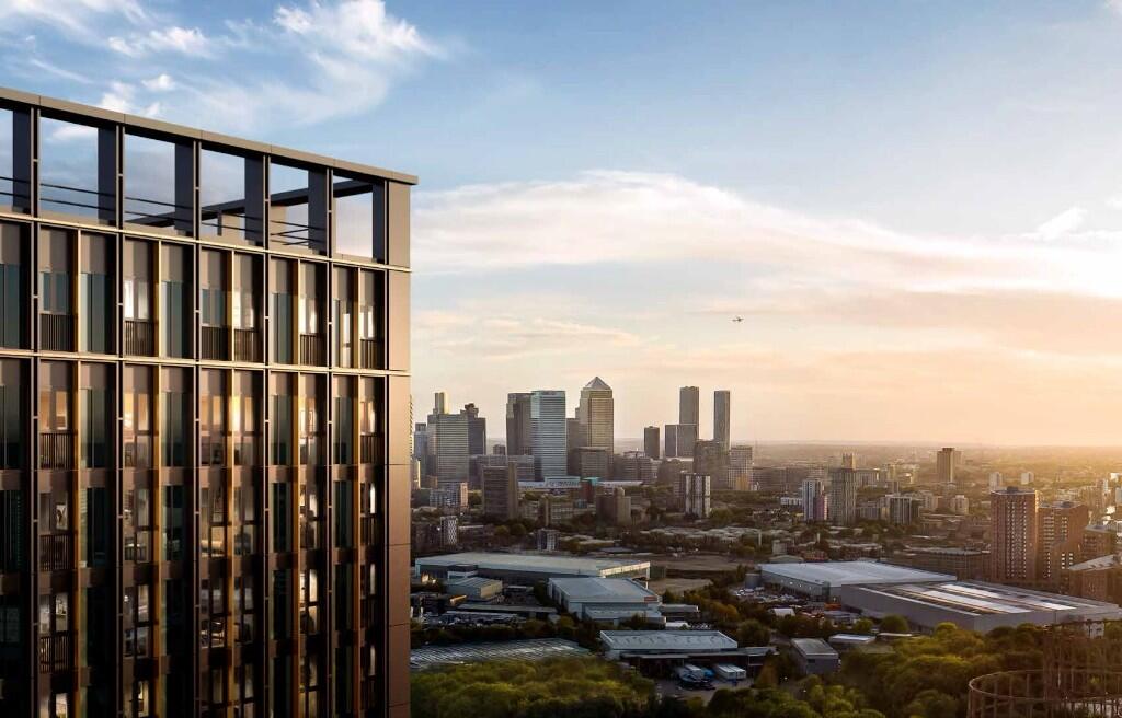 Modern 2-bedroom apartment on the 25th floor with 1 bathroom and 1 toilet, open-plan living, gym, concierge, and landscaped gardens near West Ham station.