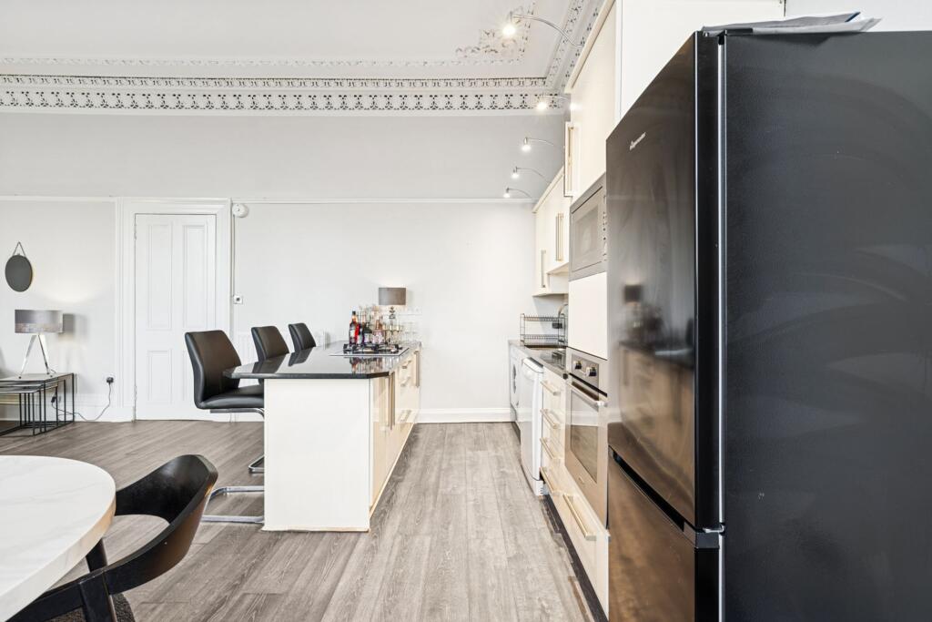 Set within one of the West End’s most desirable terraces, this beautifully presented two-bedroom first floor flat blends period charm with contemporary living — and includes the rare benefit of a private residents’ parking space.