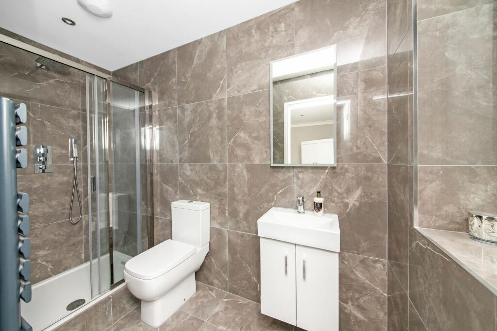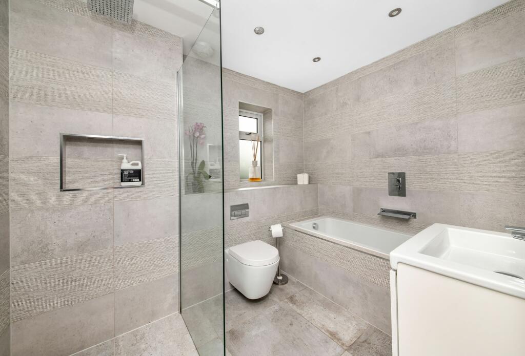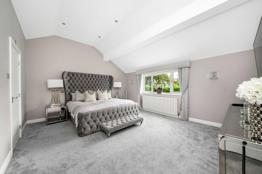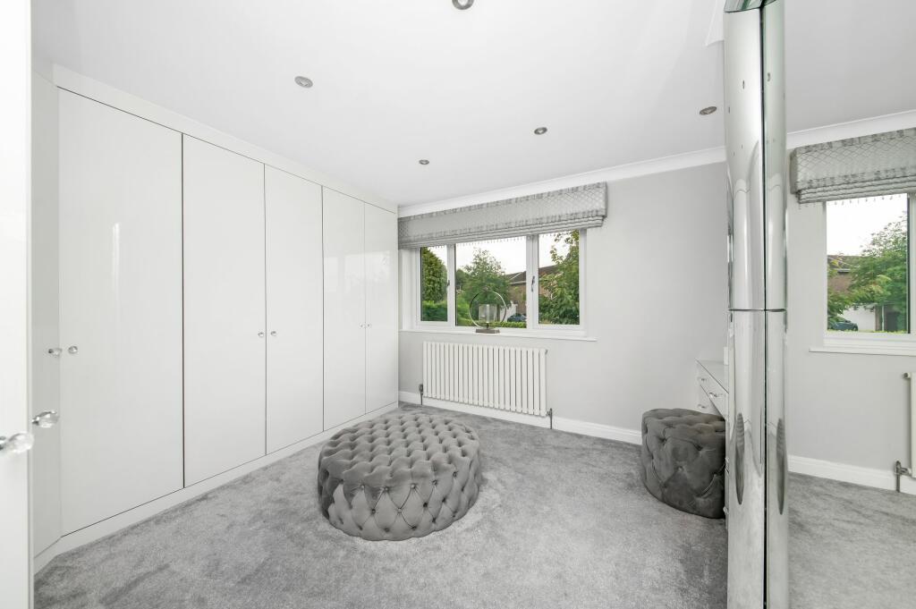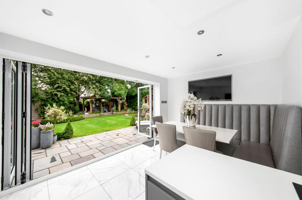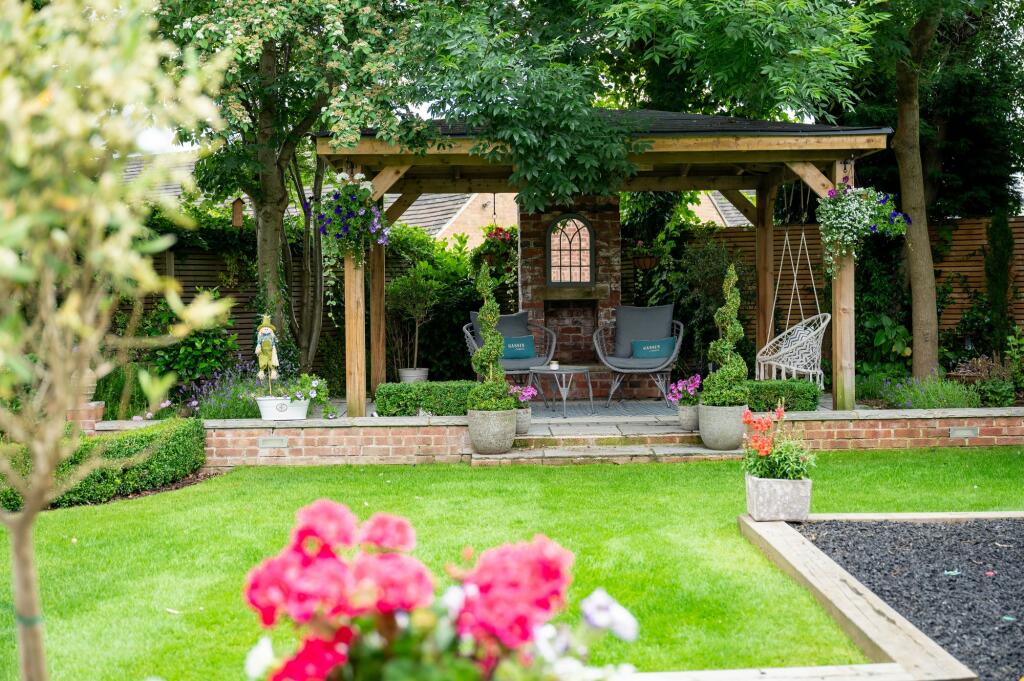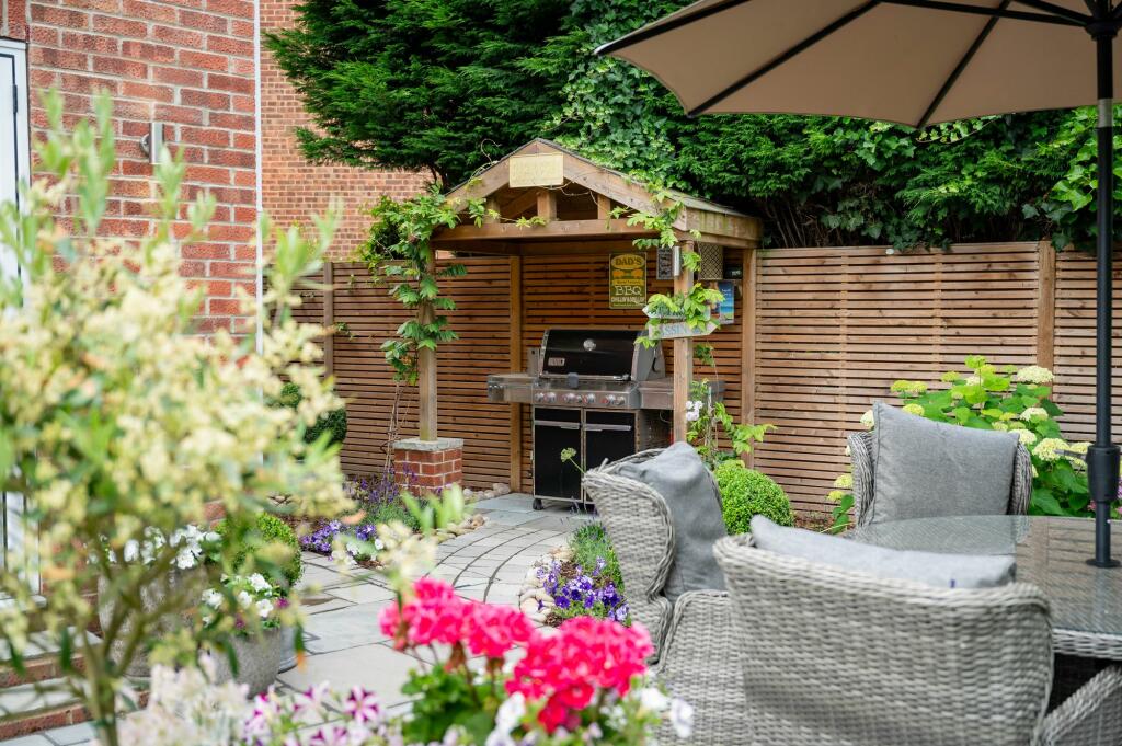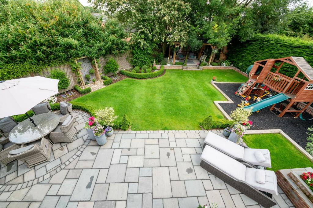Outside, the sizeable garden is a major asset. It features a well-designed patio area, ideal for outdoor entertaining, as well as a professionally landscaped lawn and a dedicated children’s play area. The overall presentation suggests a recent upgrade or refurbishment, significantly contributing to the property’s overall appeal. The inclusion of external features such as a pergola and outdoor seating areas create inviting spaces for relaxation and social gatherings.