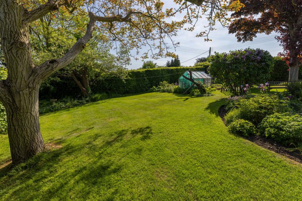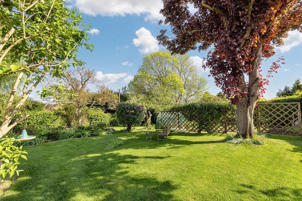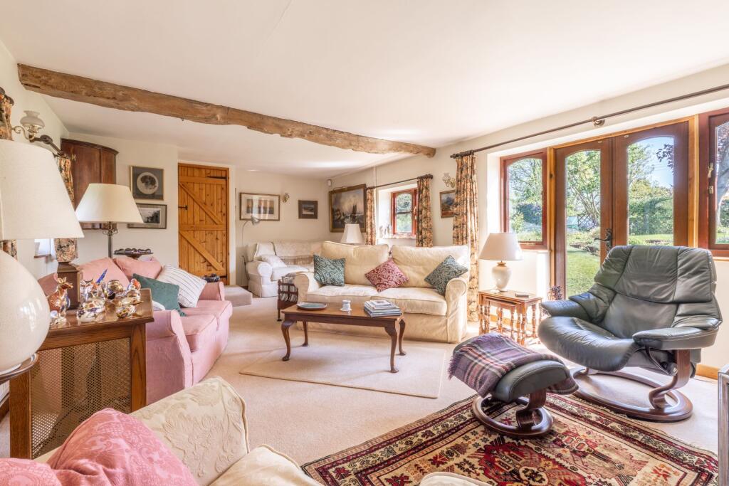 The property appears to be a traditional property, retaining many original features whilst having been modernised in places. The exposed beams and brickwork are characteristic of a period property, adding character and charm. The garden is well-maintained and sizable, providing ample outdoor space. There is also a double garage.