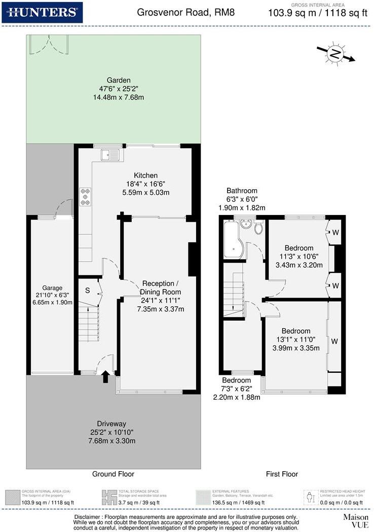 This is a three-bedroom end-of-terrace house located on Grosvenor Road, Dagenham. The property offers 1,118.37 sqft of living space and sits on a plot of 1,469.27 sqft. The property is conveniently located near schools and transportation links. The interior of the property has been modernised, particularly the kitchen and bathroom. While the property is in generally good condition, some areas could benefit from cosmetic improvements. The property benefits from a garden. The asking price of £450,000 seems reasonable given the size, location, and condition of the property.