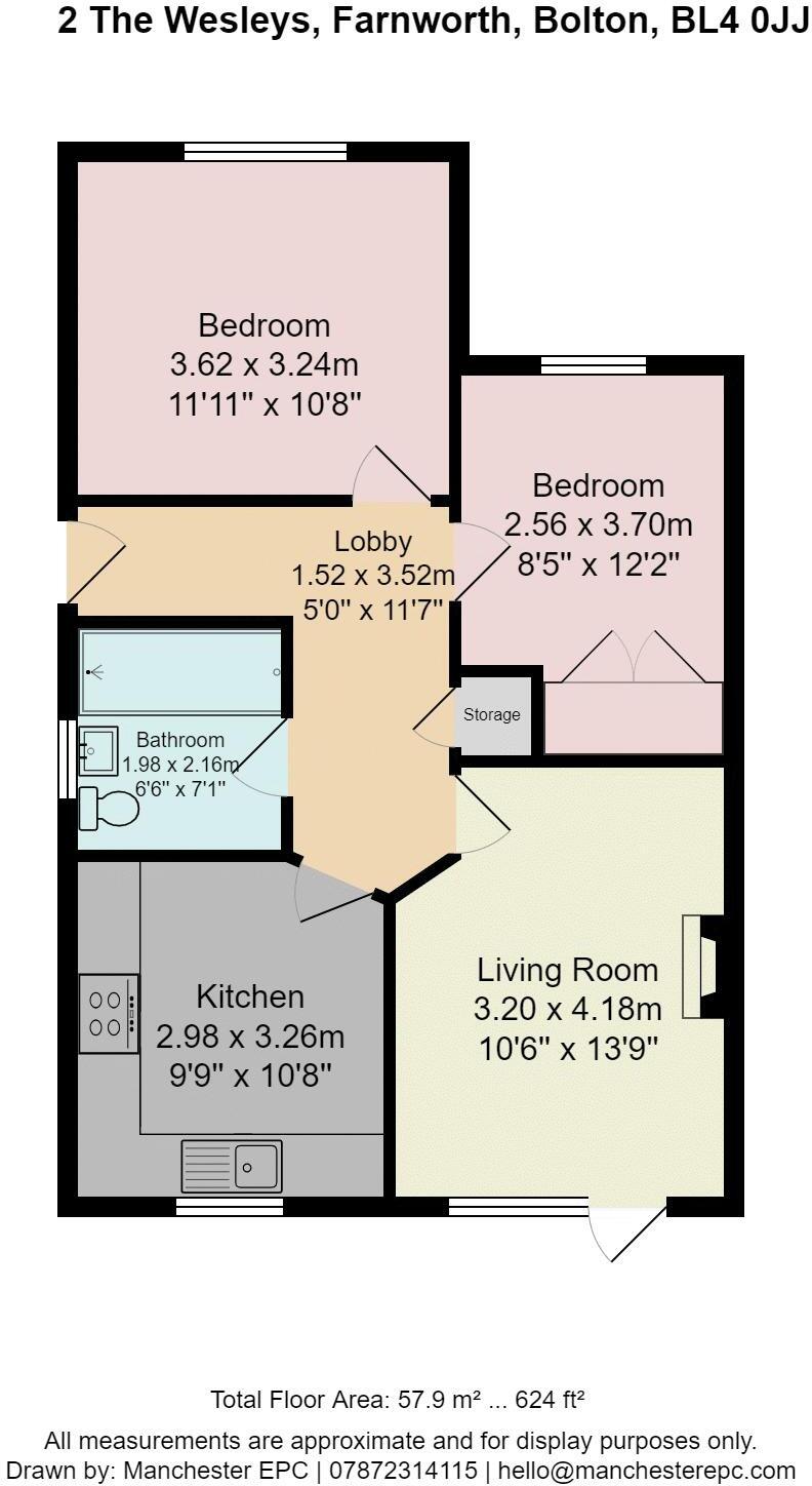 This is a two-bedroom detached bungalow located in The Wesleys, Farnworth, Bolton. The property is listed for £179,950. It features a bathroom, a square footage of 623.23, and sits on a plot of land with an area that is not specified. The property is located in a residential area with nearby schools and transportation. The condition of the property appears to be good, although it may benefit from some modernization. The property includes a front garden and a paved backyard. The price is competitive for the area and the type of property.