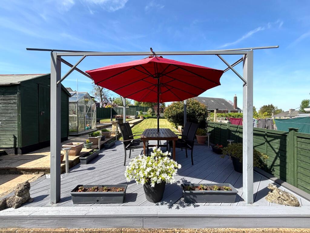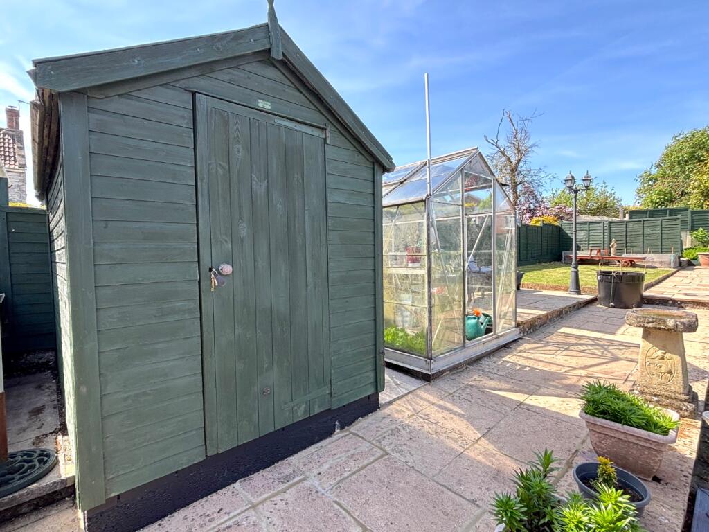 The property appears to be in good condition, with recently updated interiors and a well-maintained garden. The garden is of a good size and includes a patio area, lawn, shed, and greenhouse. The interior photos show a modern kitchen and updated bathrooms.