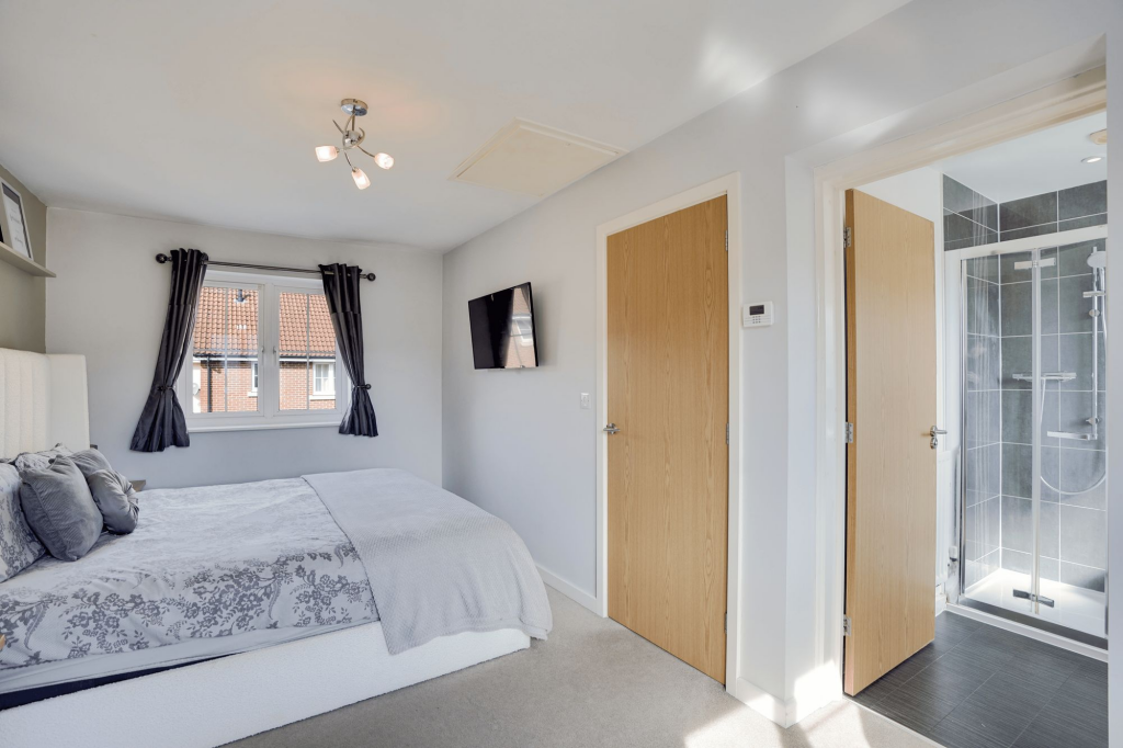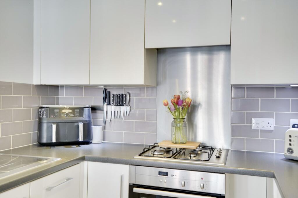 The property is a 3-bedroom, 1-bathroom end of terrace house located in Red Lodge, Suffolk. It is listed at £299,995 and has 728.82 sqft of living space. The average house price in the area is £296,693, with an average price per sqft of £311. This suggests the property’s list price is in line with the local market average. The property appears to be in excellent condition, with a modern kitchen and bathrooms. The images show a well-maintained interior and exterior. The garden is a good size, with a patio and decking area, adding to the property’s appeal. The location is close to St Christopher’s Cevcp School (0.62 KM), a school that requires improvement according to Ofsted. Other schools are within a reasonable distance, but their Ofsted ratings are not provided. The proximity to Kennett train station (2.70 KM) provides convenient access to transportation. Based on the images, the property appears modern and well-maintained. There is no evidence to suggest it needs renovation. The property includes features such as a garage and a garden.