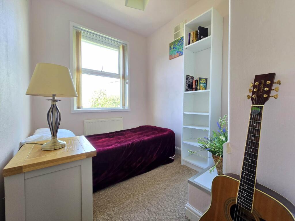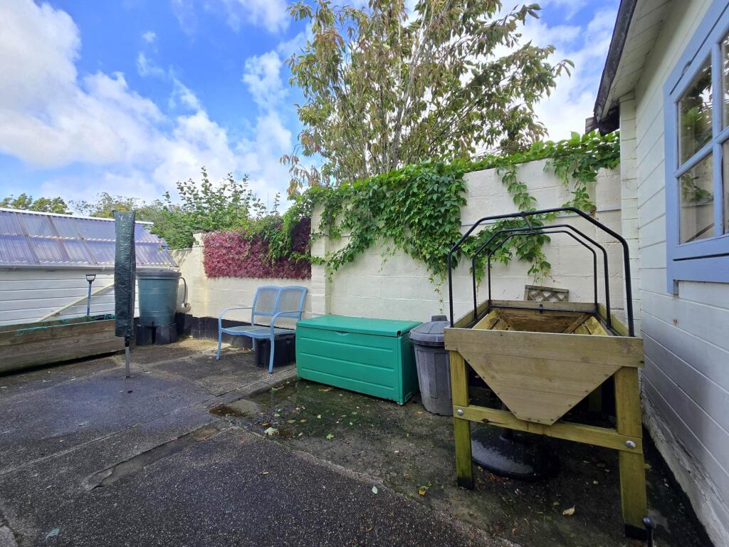 This is a detached property on Old Barnstaple Road, Bideford. It features three bedrooms and one bathroom, with a total square footage of 818.06 sqft. The property includes a garden with a shed and patio area. The house appears to be in generally good condition, with a modern kitchen and bathroom. The property is located close to local schools and amenities. The listing price is £325,000, which is slightly below the average for the street.