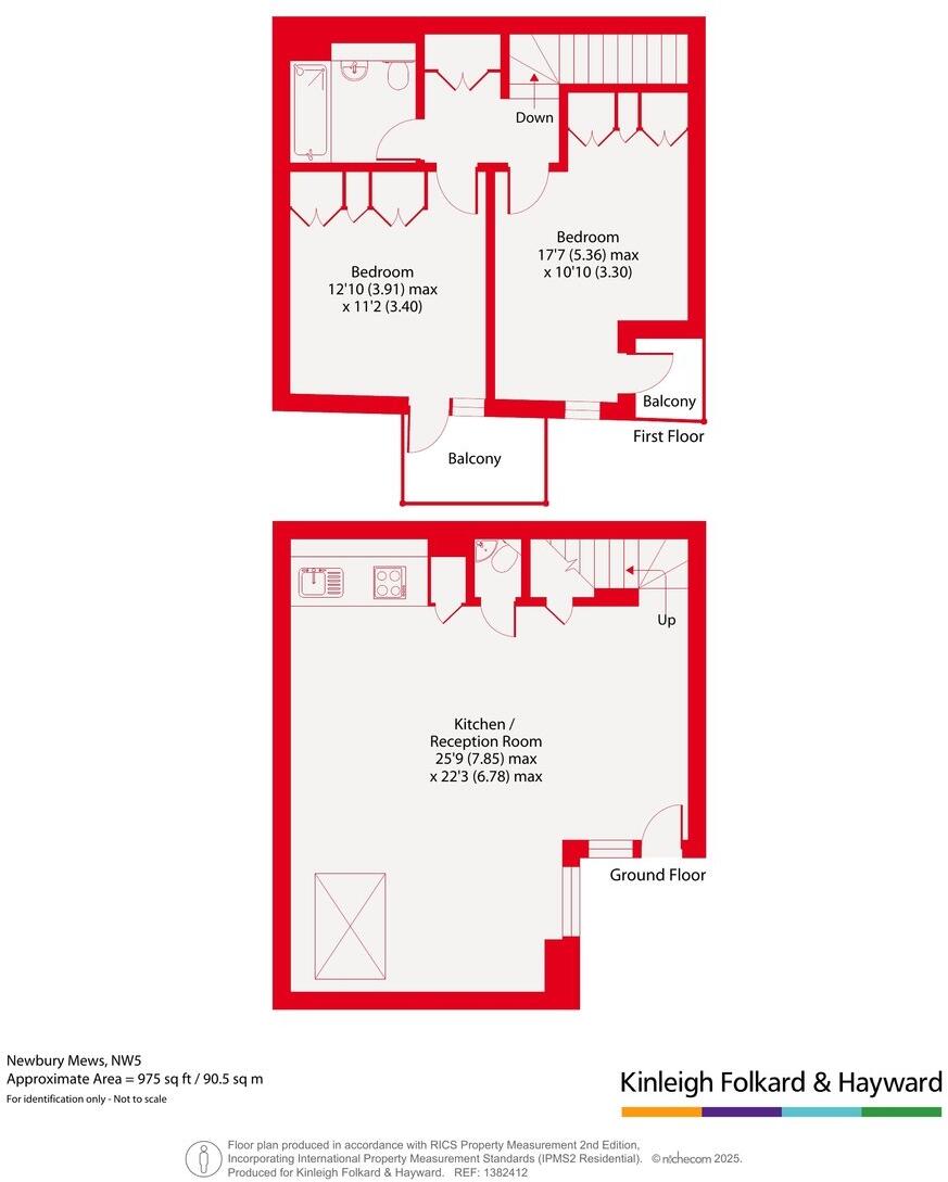 This is a 2-bedroom house located in Newbury Mews, Kentish Town, London. The property is 975 sqft and is listed for £850,000. The property is located in a desirable area, with good access to transportation, schools and local amenities. The property appears to be in reasonable condition, but the bathroom looks dated and in need of renovation. The property has a small balcony, but no garden. The price is slightly below the average for the area, but higher than some recent sales on the same street.