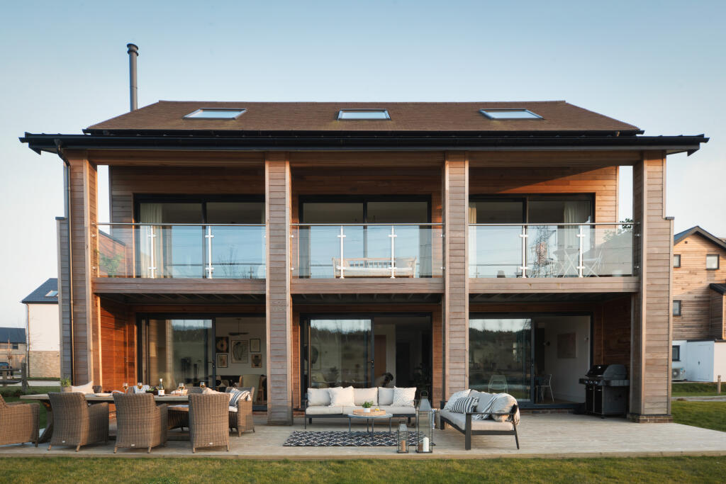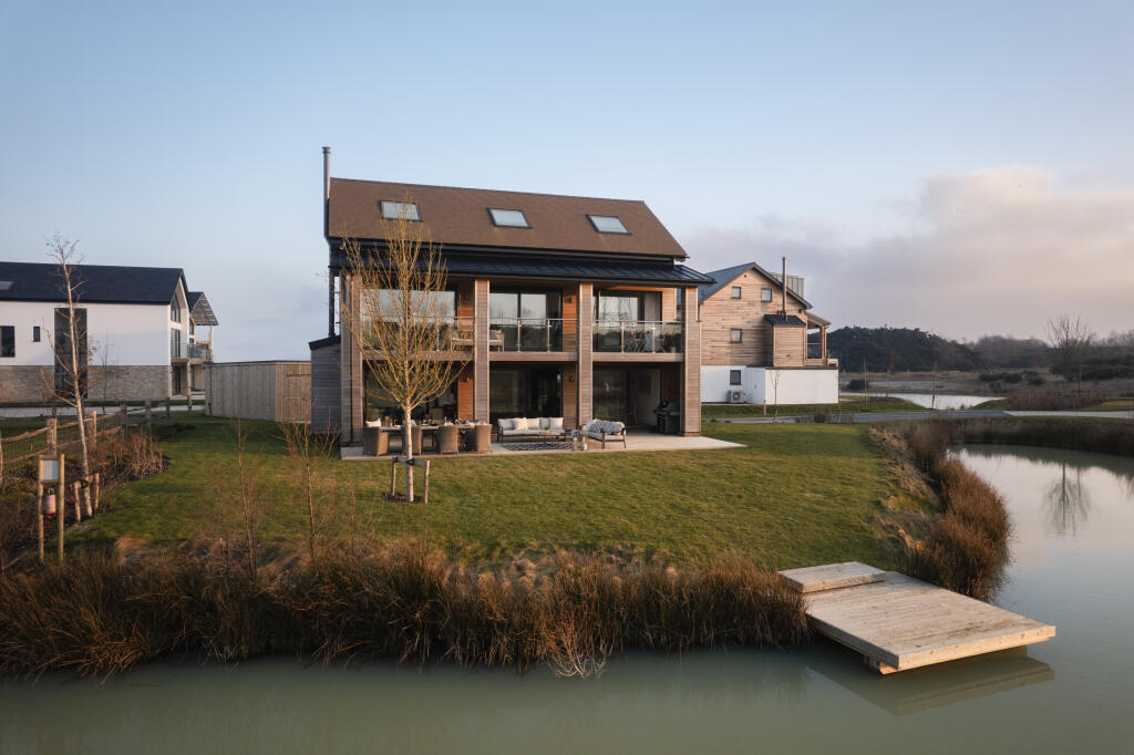 Occupying an exclusive and secluded large corner plot on Overton Island village, this three-storey Barn design has the added benefits of spectacular waterside access and views. It includes a double boat store, traditional rowing boat, jetty and parking for three vehicles.