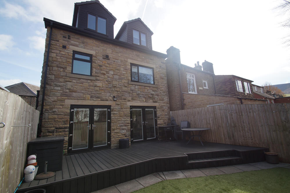 This property is a 4-bedroom, 3-bathroom detached house located in Greenfield, Oldham. It benefits from being close to highly-rated primary schools such as Greenfield Primary School (Outstanding Ofsted rating) and Bright Futures School (Good Ofsted rating), both within a short walking distance. Greenfield Train Station is also conveniently located nearby, providing easy access to Manchester and other areas. The property itself appears to be in excellent condition, recently renovated to a high standard with a modern kitchen and bathrooms. The images show a contemporary interior with a good-sized garden featuring a composite decking area. The list price of £525,000 is higher than the average price for the area (£372,333), but considering the property’s size (1080 sqft), condition, and desirable location, it could be considered reasonable, especially when compared to nearby properties with similar features. The lack of plot size information in the provided data makes it difficult to fully assess the land value.
