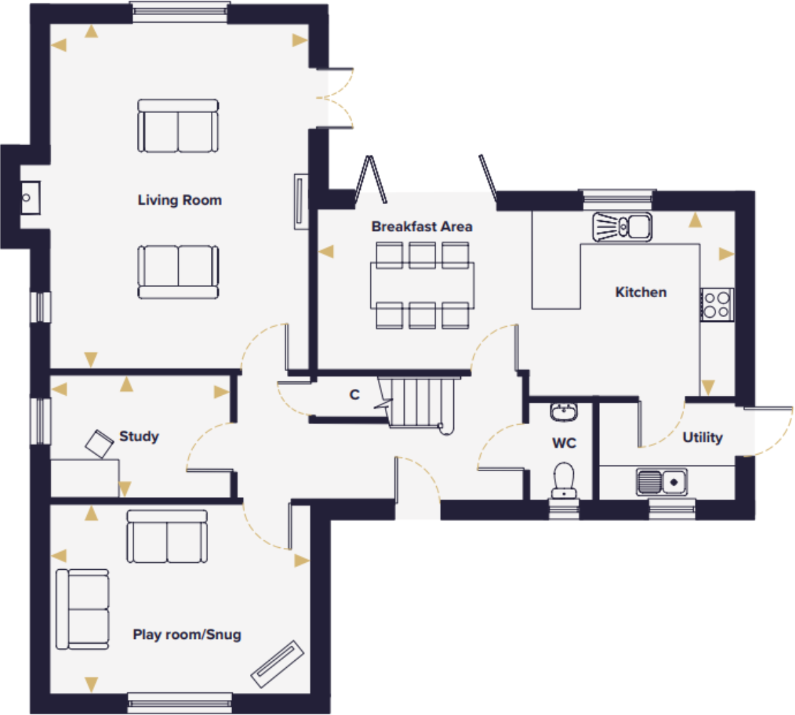 The Bayfield is a large 4 bed family home OVERLOOKING OPEN SPACE with an OPEN PLAN KITCHEN/FAMILY/DINING area, SEPARATE LIVING ROOM, STUDY & SNUG, 4 DOUBLE BEDROOMS, two with EN SUITE and a family bathroom