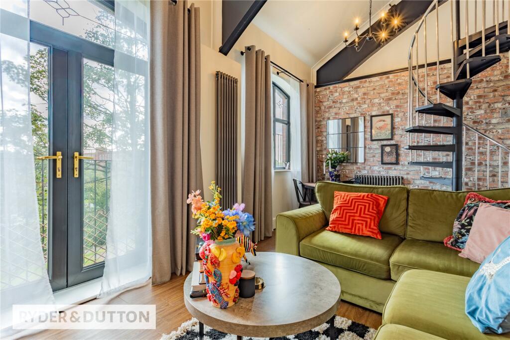 This is a two-bedroom apartment located in Royton, Oldham. The property is well-presented and appears to be in good condition. The apartment features a modern kitchen and bathroom, and the living area has exposed brickwork and a spiral staircase. The property benefits from a balcony and access to a communal garden. The apartment is located close to local amenities and schools, making it a suitable home for a small family or young professionals.