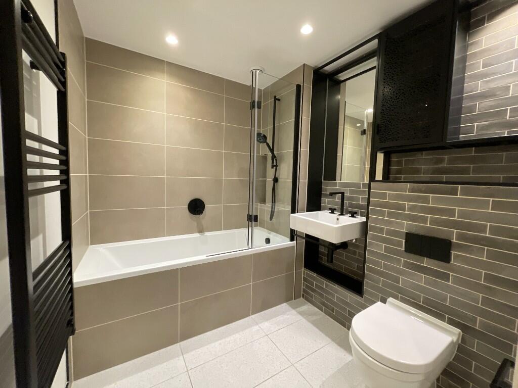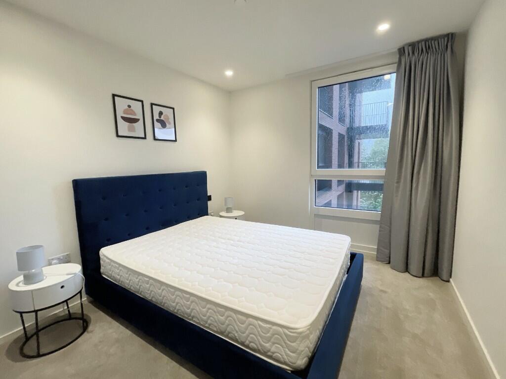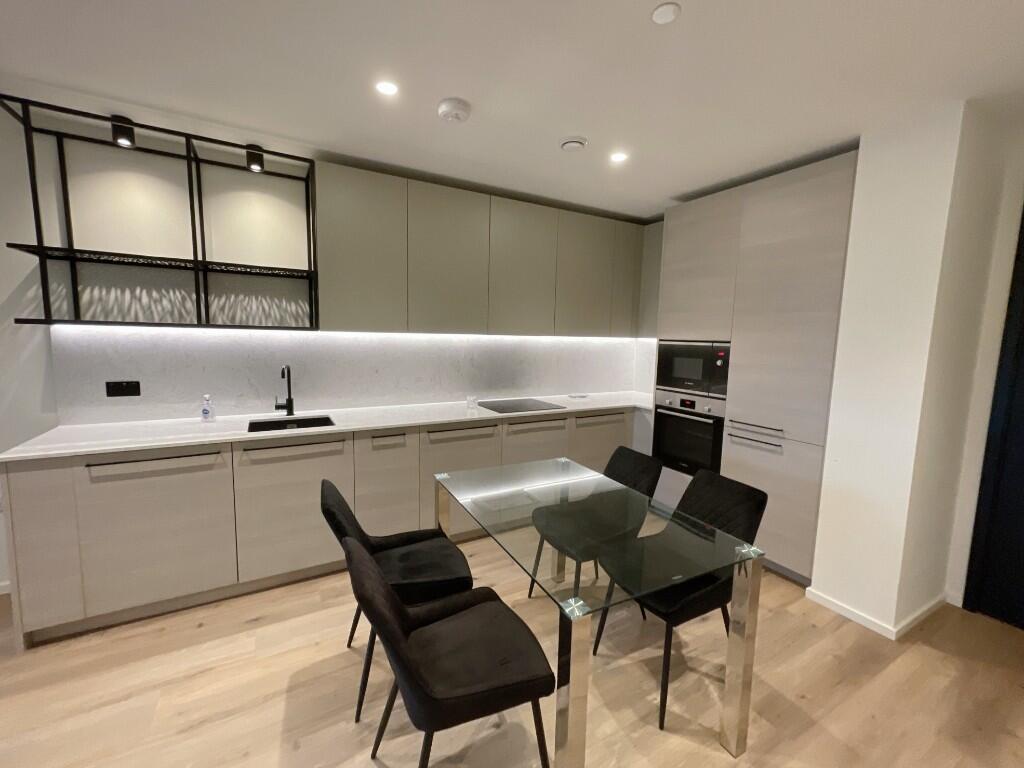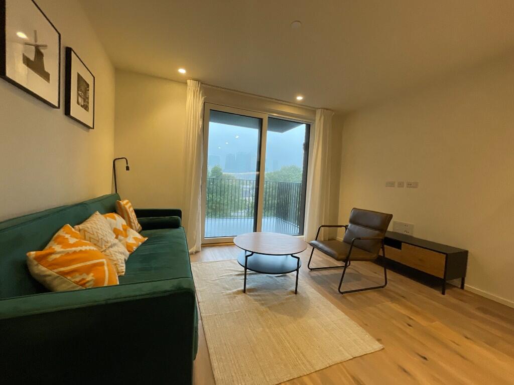 Modern 1-bed apartment in Poplar Riverside, open-plan living, luxury finishes, and access to pool, spa, gym, co-working spaces, and 24/7 concierge.