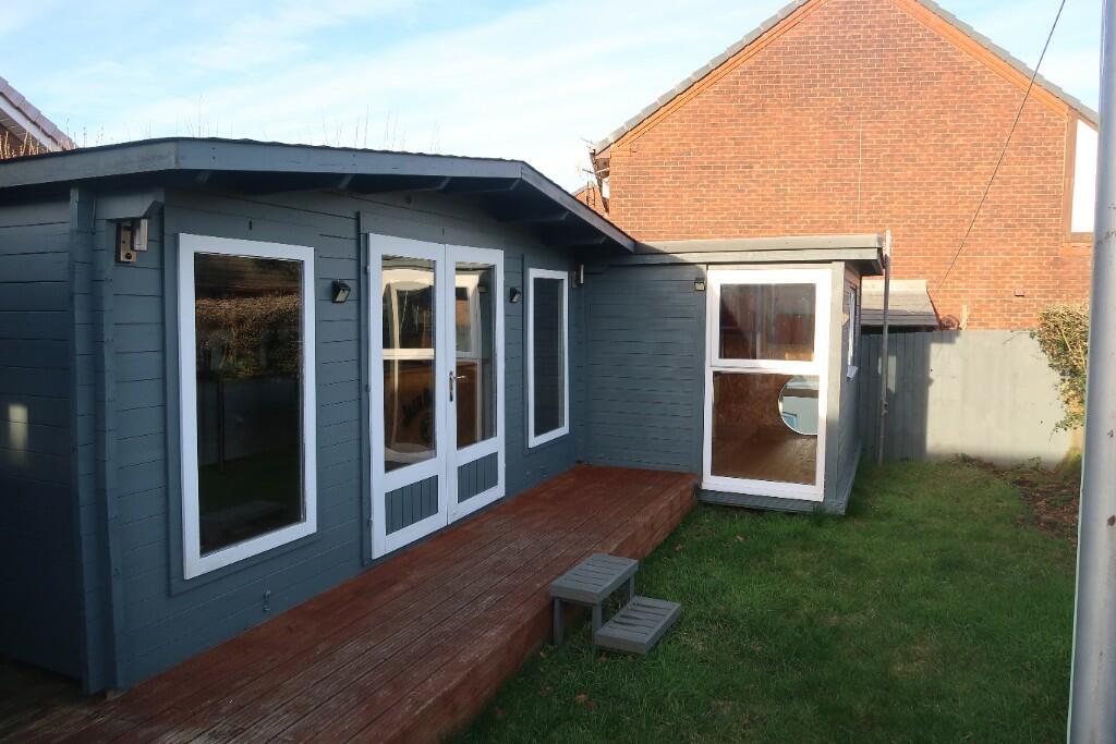 A superbly presented mid terrace property for sale offering a modern fitted kitchen with integral appliances and dining area, good size lounge, ground floor bathroom and three double bedrooms with en suite to master. Double garage. Off road parking. Summerhouse, bar and games room. No chain.
