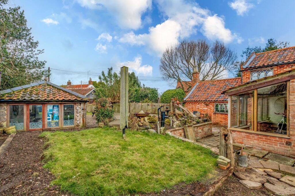 This property at Toad Row, Henstead, presents a unique opportunity in the East Suffolk countryside. The charming character of the property is undeniable, with exposed beams, original features, and a rustic aesthetic that creates a warm and inviting atmosphere. The layout encompasses three bedrooms and two bathrooms, providing ample living space. The large living area with exposed beams and a wood-burning stove is a focal point, offering a cozy and inviting space for relaxation. The kitchen is a blend of modern and rustic elements, with a mix of updated cabinetry and exposed brickwork. However, the kitchen and bathrooms appear to be in various stages of completion or renovation, which could be considered a drawback for some buyers. The property also benefits from a sunroom/conservatory, which provides additional living space and natural light. The outdoor space includes a garden, though it appears relatively small and requires some landscaping work. Outbuildings are present, offering potential for additional storage or development. The proximity to The Old School is a significant advantage for families, while the distance to train stations might be a consideration for commuters. Overall, the property offers a blend of character, charm, and potential, but buyers should be prepared for some renovation work to complete the property to their desired standard. The price seems relatively reasonable given the size and location, but the need for work should be factored into the overall value assessment.