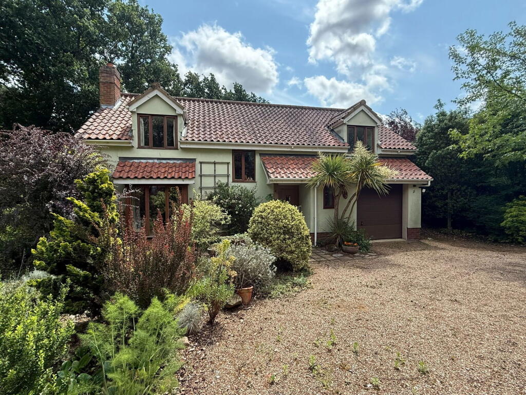 A detached three bedroom, chalet style house with delightful landscaped gardens of nearly half an acre, at the end of a no-through road in Melton close to Woodbridge and the River Deben.