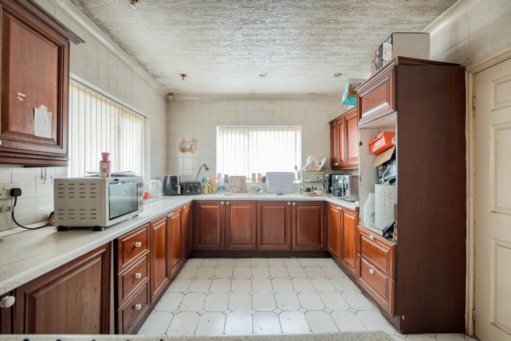 This detached bungalow in Tipton, West Midlands is listed at £300,000. The property is in need of significant renovation, as evidenced by the interior photos showing damaged walls, ceilings, and outdated fixtures. The kitchen and bathrooms appear dated and require updating. The exterior shows a typical bungalow design, with a garden present. While the location is close to schools and transportation, the overall condition of the property significantly impacts its value. Compared to the average price per square foot in the area (£269), the list price is higher, considering the extensive renovations needed. The plot size is 1,771 sqft, which is relatively small for a detached property. Several nearby properties are listed at lower prices, suggesting the £300,000 asking price may be ambitious given the property’s current state.
