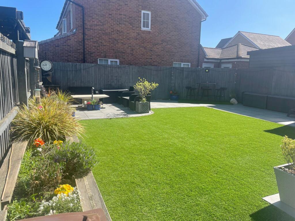 The property itself is a modern, well-maintained home. The images show a recently renovated or newly built property with a contemporary interior design. The kitchen and extension are particularly noteworthy, suggesting a high level of finish and modern amenities. The garden is well-landscaped with artificial turf, offering a low-maintenance outdoor space.
