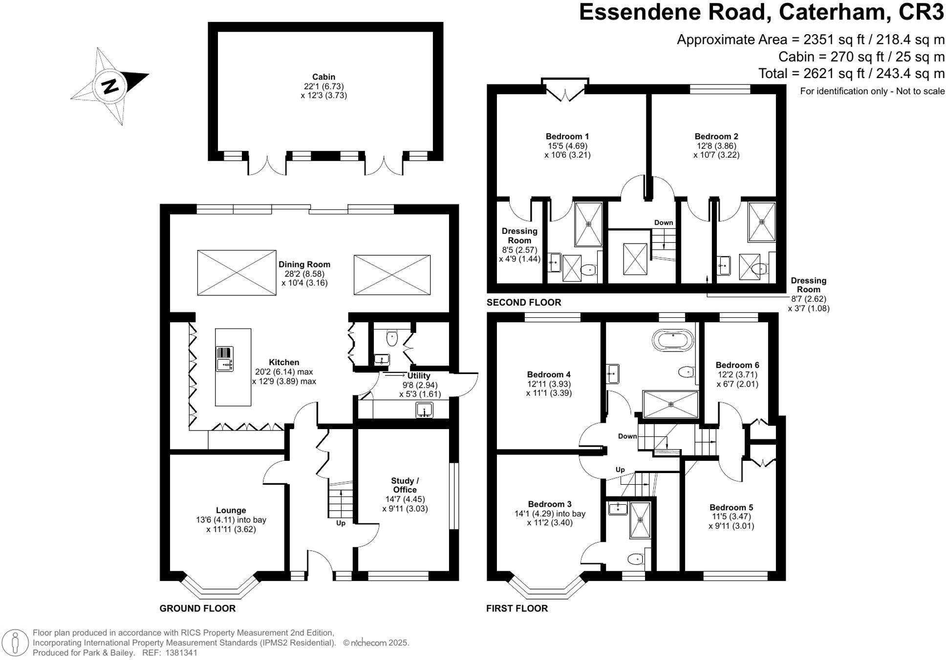 This is a detached property located in Caterham, Surrey. It features 6 bedrooms and 4 bathrooms, with a total square footage of 2,621 sqft. The property appears to be in good condition, with modern interiors and a well-maintained garden. The location is convenient, with nearby schools and transportation links. The asking price is £1,200,000. The property benefits from a modern kitchen, utility room and a well sized garden with a detached outbuilding. The property also has a large driveway.