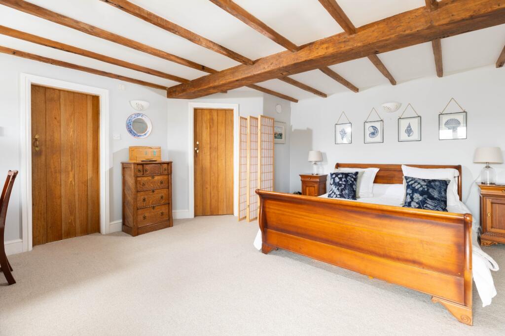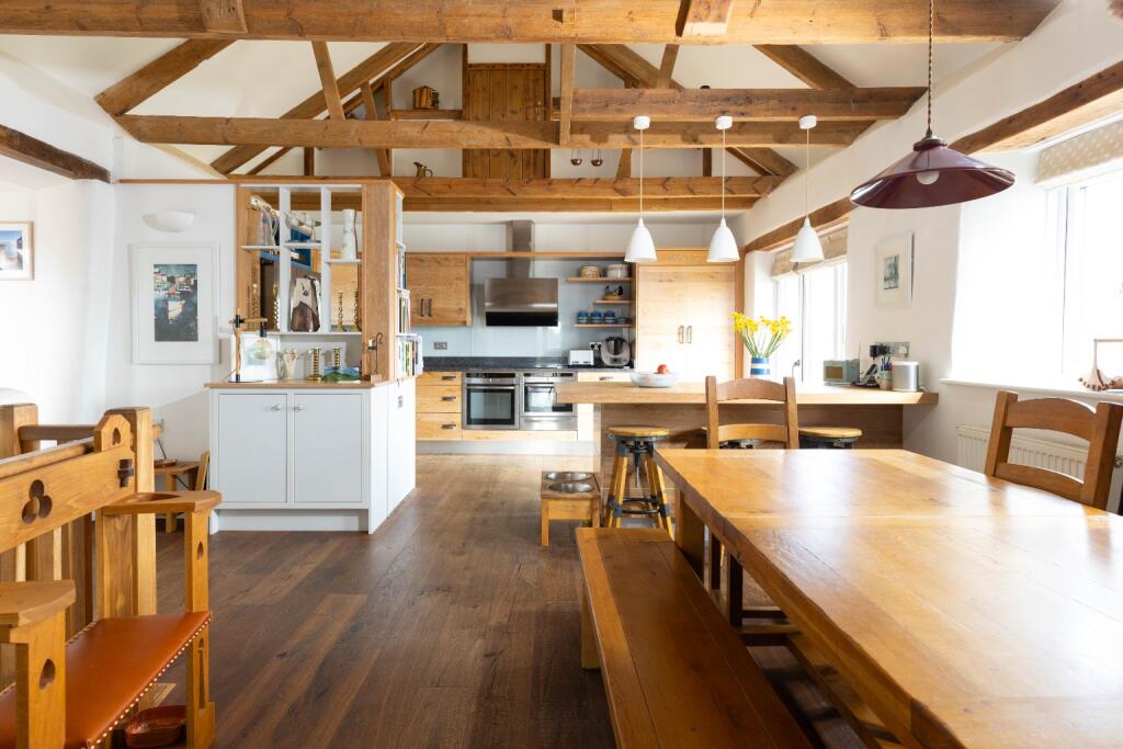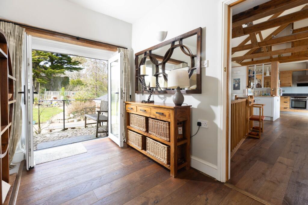 Stunning 4/5 bed barn conversion with breathtaking countryside and sea views. Reverse living maximises light and space, featuring a vaulted kitchen/dining area, elegant living room with Juliet balconies, and luxurious principal suite. Landscaped gardens, ample parking, and excellent school catchment