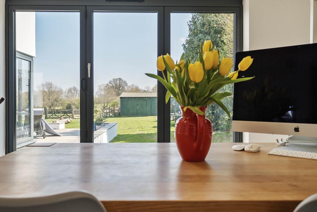 An immaculate recently extending and completely refurbished four bedroom detached family home with contemporary open plan living, located in a quiet spot with stables, paddocks and field shelters. Further 3 acres available to rent by separate negotiation. About 2.2 Acres.