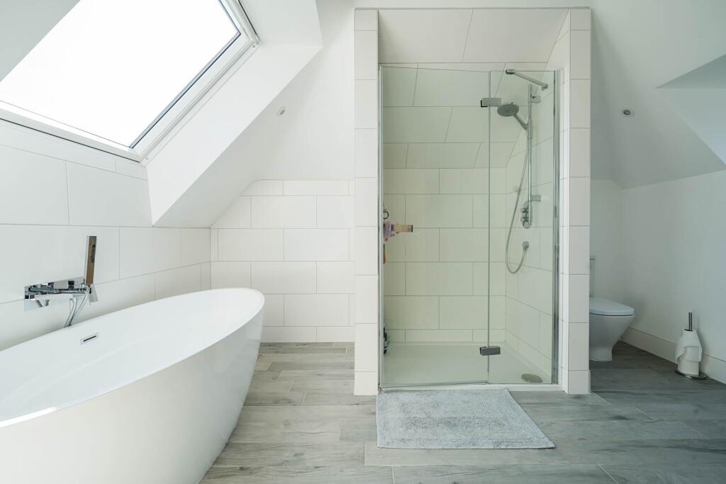 The property appears to be in excellent condition, recently renovated to a modern standard. The images showcase a contemporary interior with high-quality finishes and fixtures. The large windows and open-plan living area create a bright and airy feel. The exterior is also well-maintained, and the property benefits from a substantial garden and outbuildings, including stables, suggesting suitability for equestrian pursuits. This adds significantly to its value.