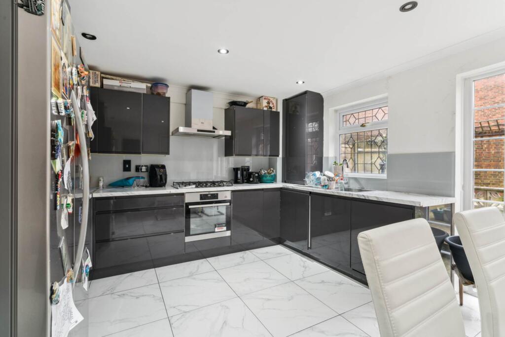 This 5 bedroom, 3 bathroom end of terrace home spans three floors with a versatile layout. It features a converted garage living room, two kitchens, and multiple bathrooms, including an ensuite. Outside, there`s a decked rear garden and parking for two cars. Located close to Borehamwood High Street