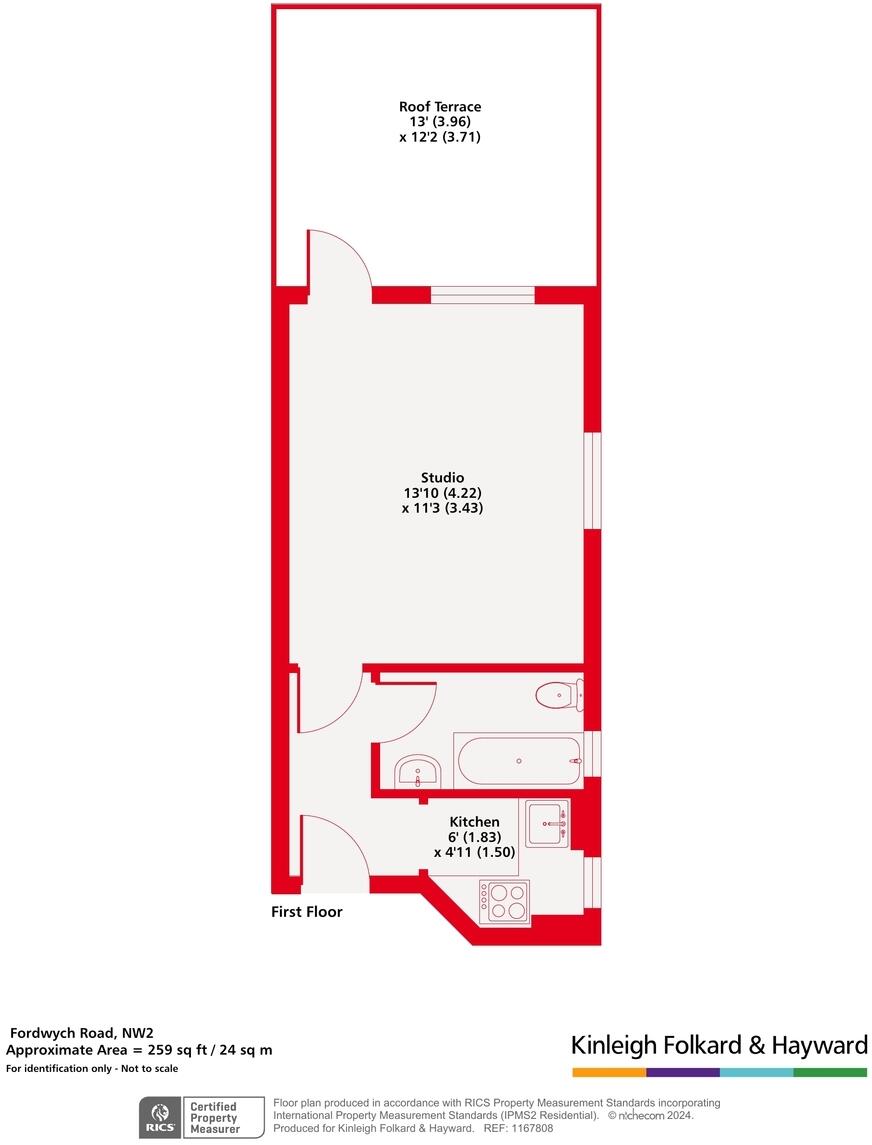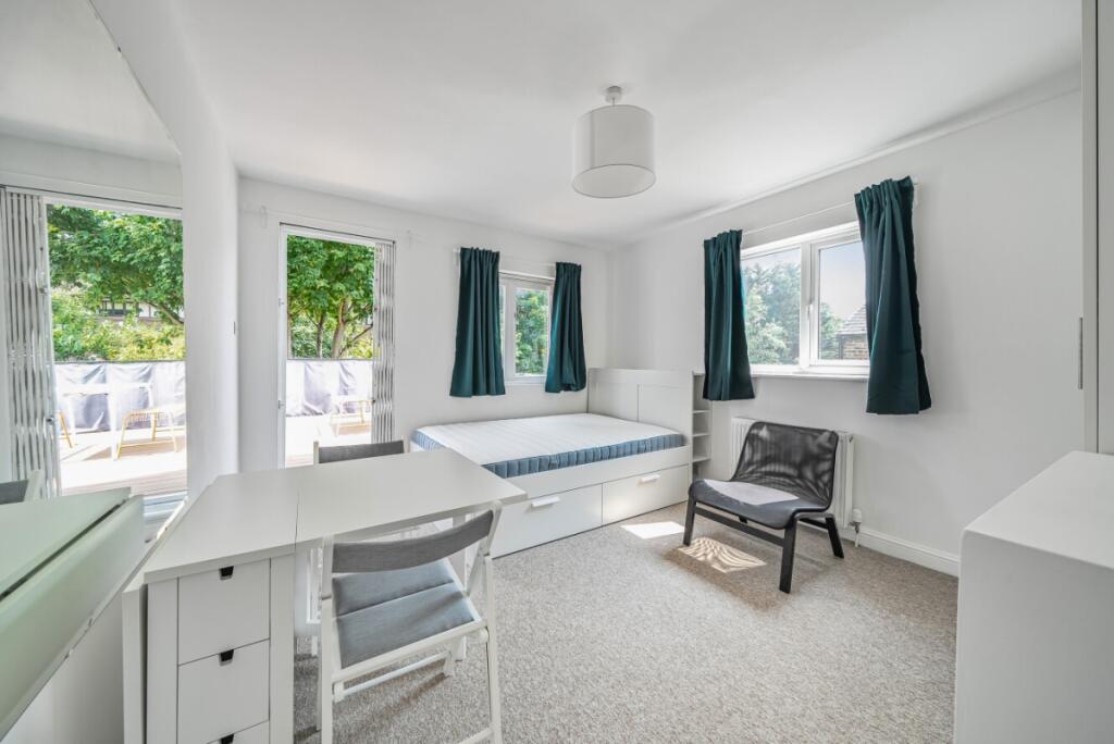 A well proportioned studio flat with separate kitchen and a huge private roof terrace located on Fordwych Road.