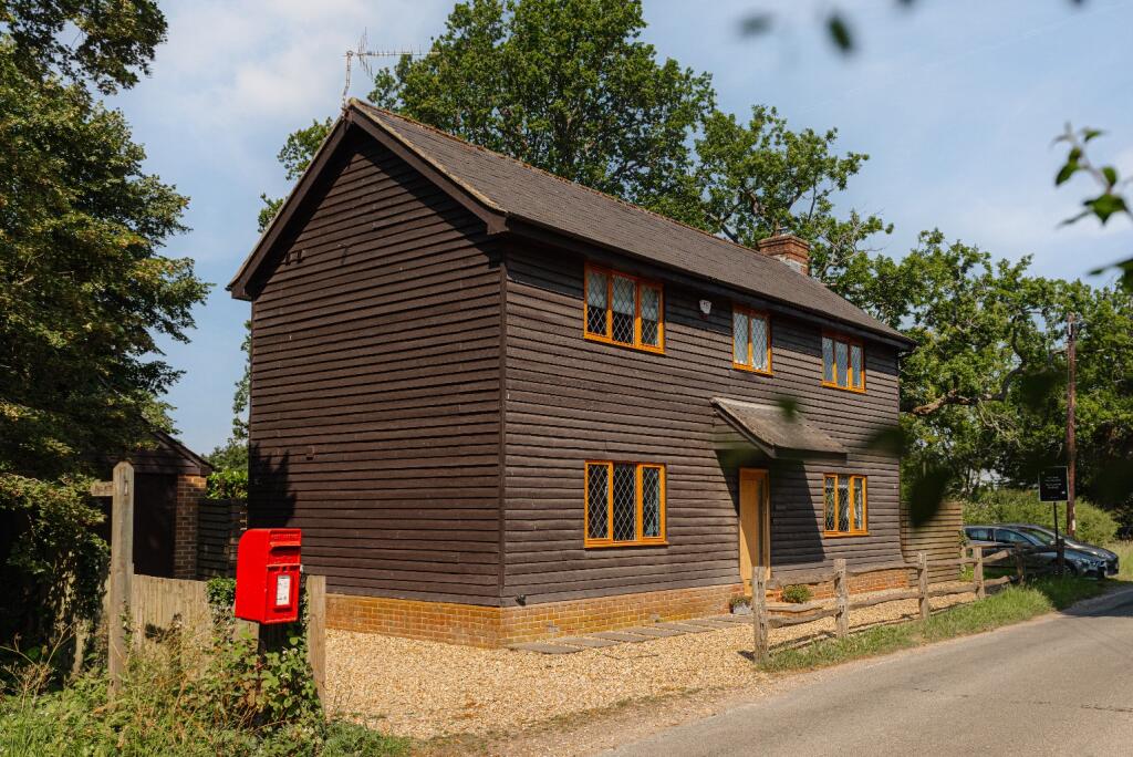 This 4-bedroom, 2-bathroom property located on New House Lane, Redhill, presents itself as a charming home with a modern interior. The exterior showcases the character of a traditional building, possibly a converted barn or similar, with dark wood cladding. The interior, however, has been renovated to a modern standard, with a contemporary kitchen and updated bathrooms. The property features multiple living areas and what appears to be a small, but well-maintained, garden.