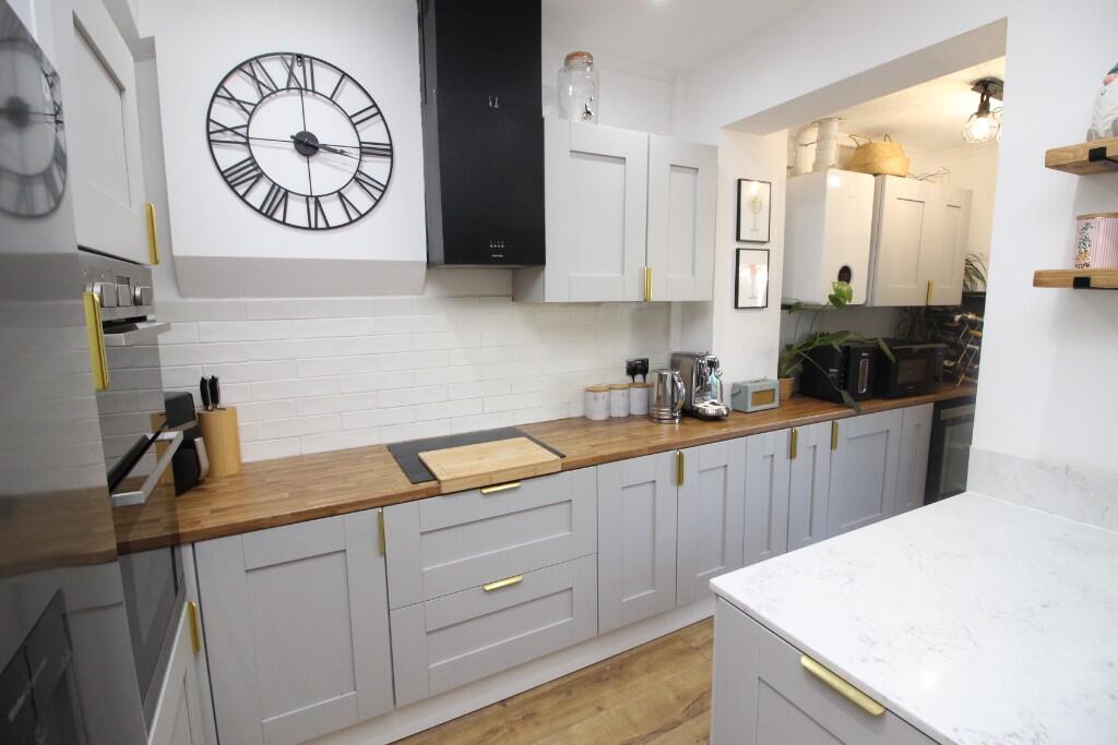 Connor Prince are pleased to offer this extended and recently refurbished, three bedroom terraced family home with an open plan fitted kitchen/dining room, utility room/cloakroom, upstairs white bathroom suite, 50ft rear garden with detached double garage and off street parking.