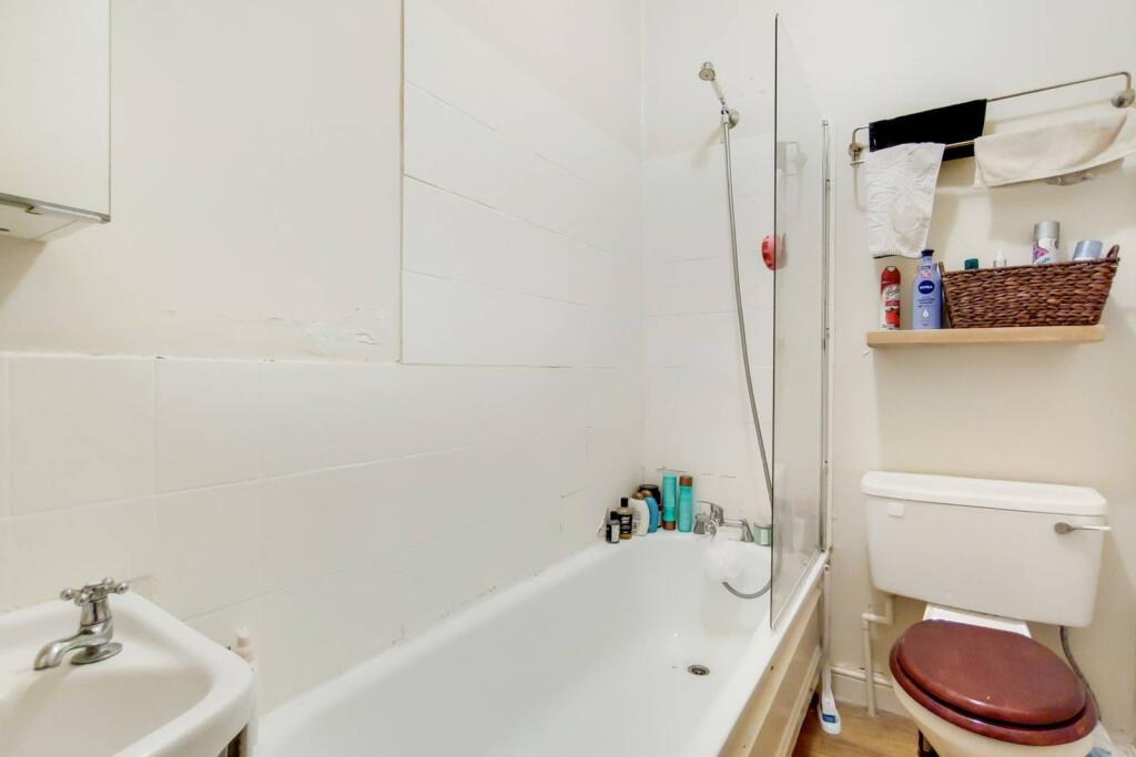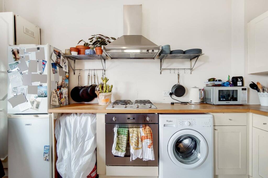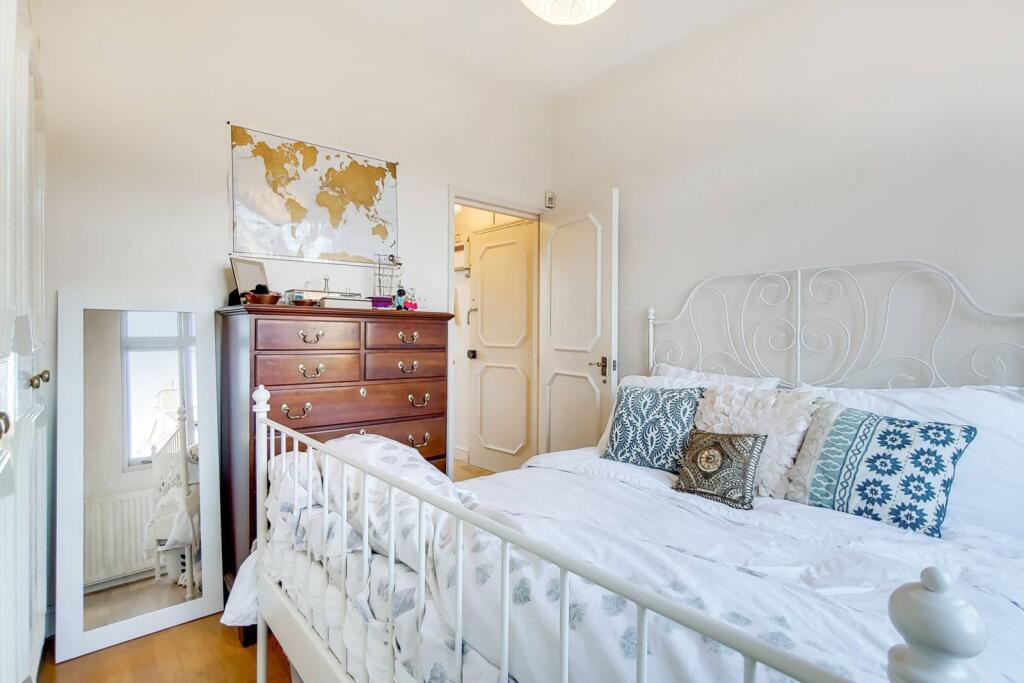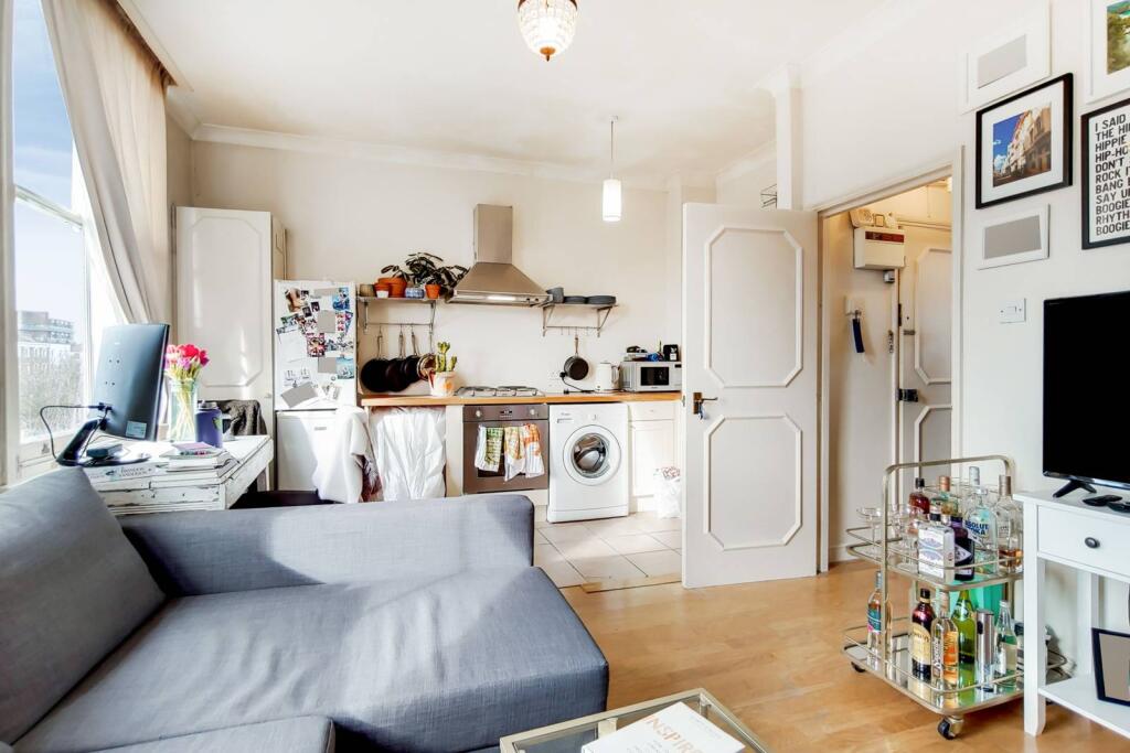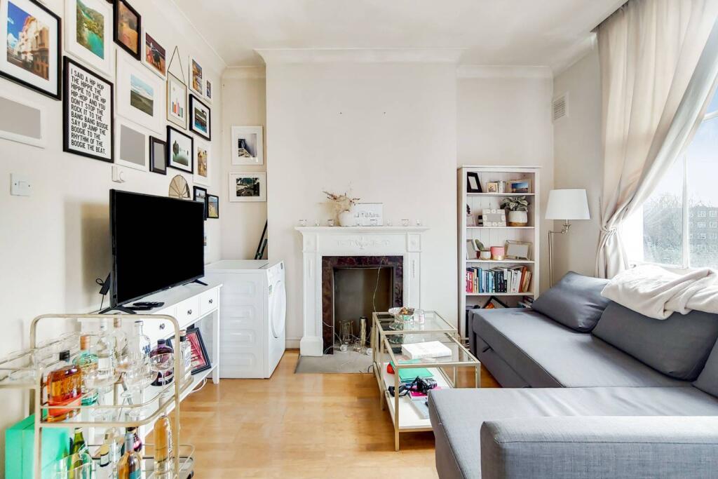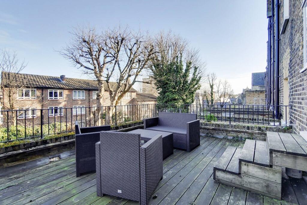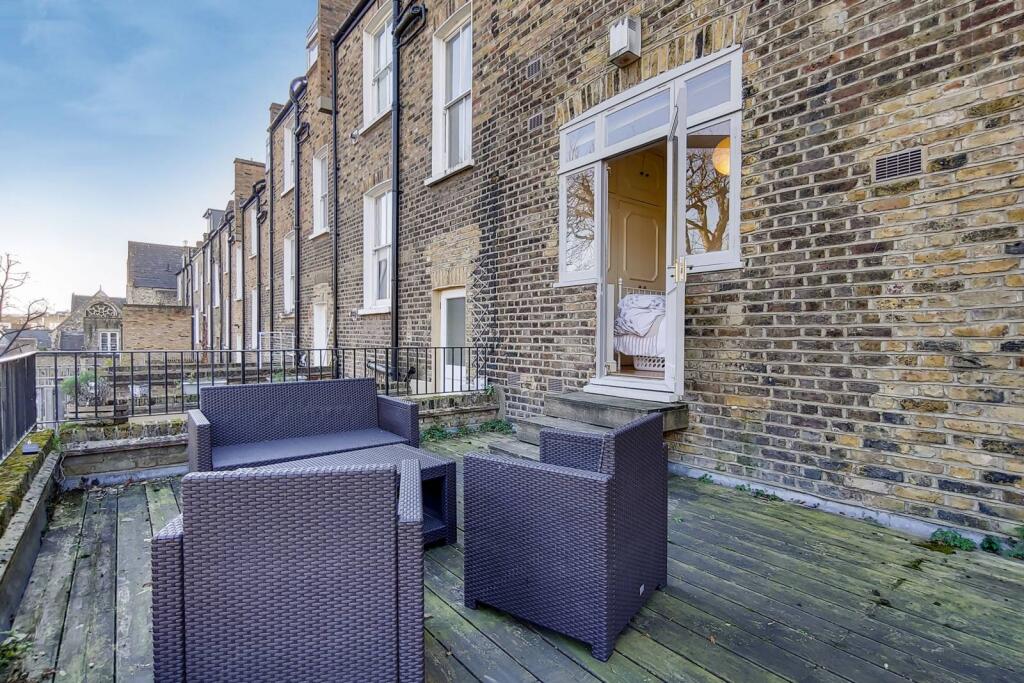LONG LET. A Victorian building boasts an exquisite and well-lit 1 bed flat, with a decked terrace providing entertaining space. A chic fitted kitchen accompanies an open plan reception with an opulent fireplace and sash windows.