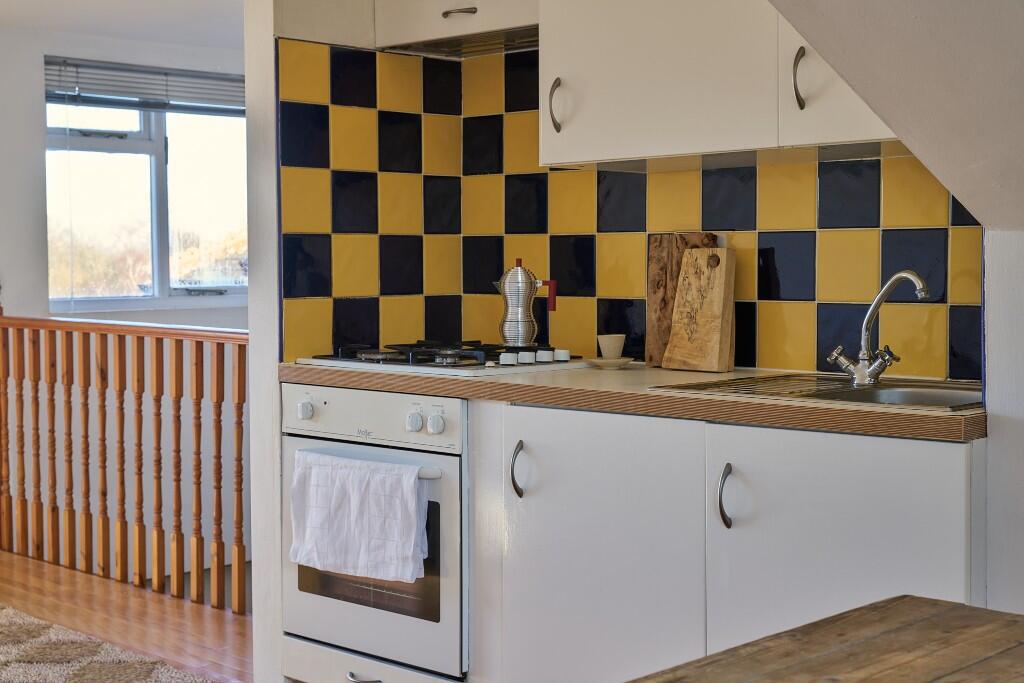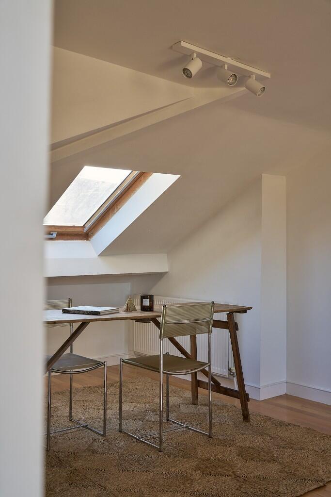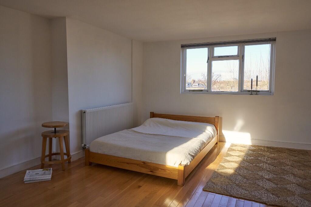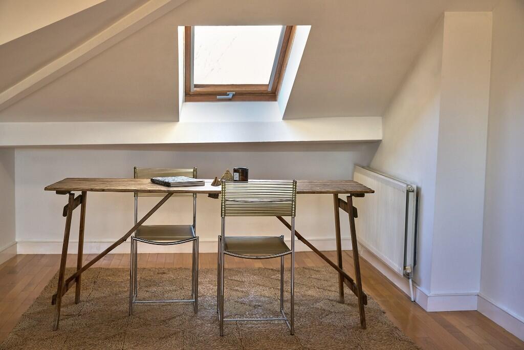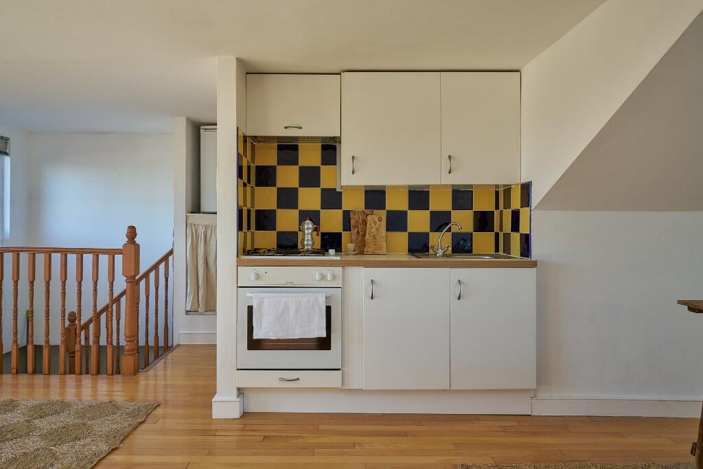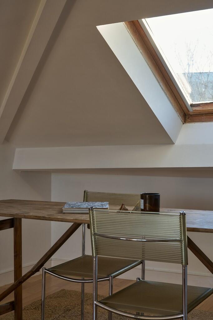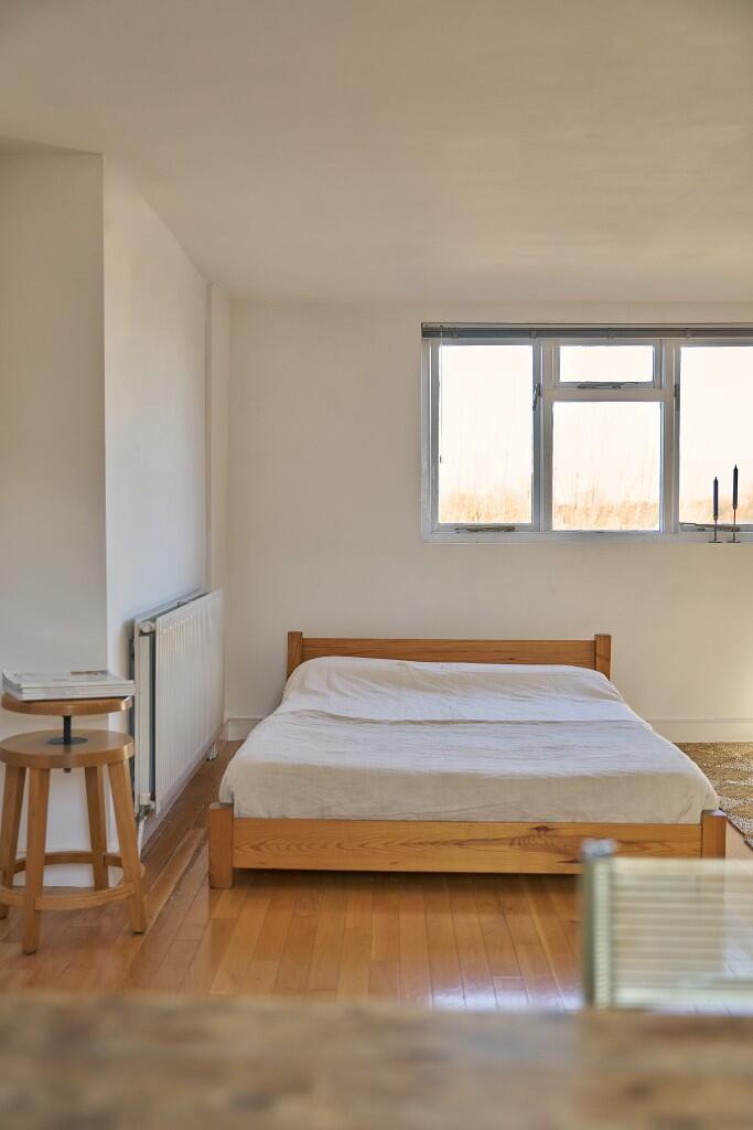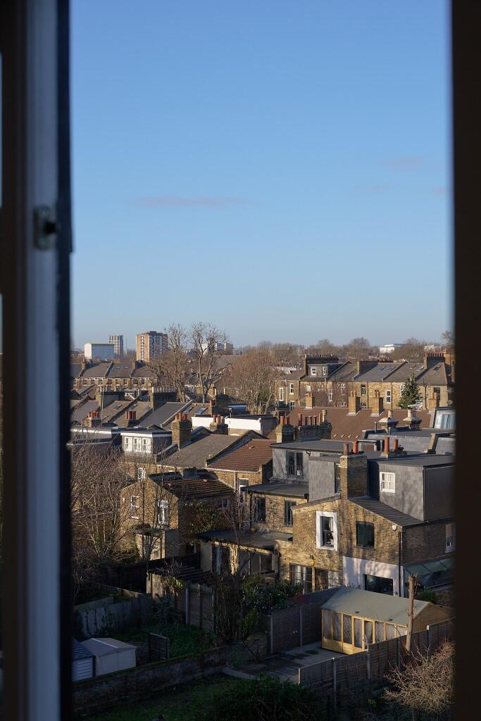 Occupying the third floor of a handsome Victorian terrace in Clapton, this light-filled studio apartment has expansive views over the gardens, rooftops and spires of North Hackney. Simply renovated with playful pops of colour, this lofty space is a tranquil hideaway amongst the bustle of East London